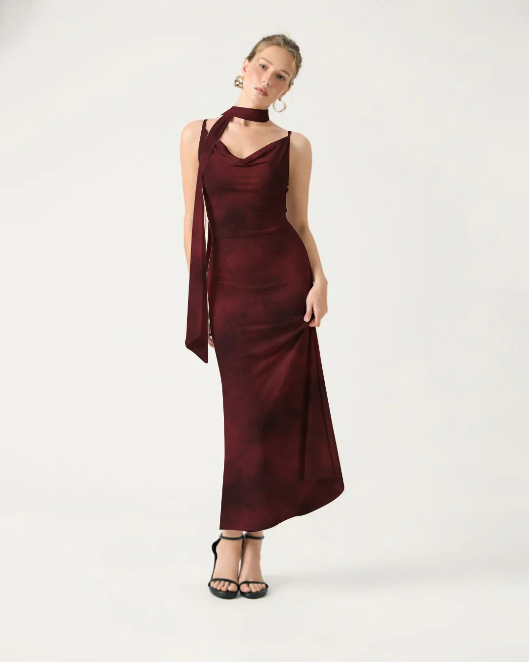 Jersey Cowl Neck Ruched Mermaid Maxi Dress With Scarf is all about soft drama and sleek confidence. This jersey cowl neck ruched mermaid maxi dress with scarf features a flattering cowl neckline with delicate ruching at the waist that enhances your natural shape. The mermaid silhouette hugs through the hips and flares gently at the hem for that elegant flow. The matching scarf detail adds a statement touch, making this jersey cowl neck ruched mermaid maxi dress with scarf feel elevated yet minimal.