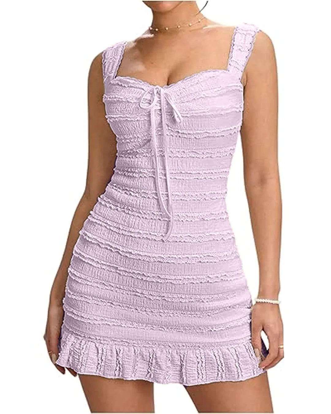 Lace Ruffle Tank Bodycon Mini Dress with Knot Front in Lilac