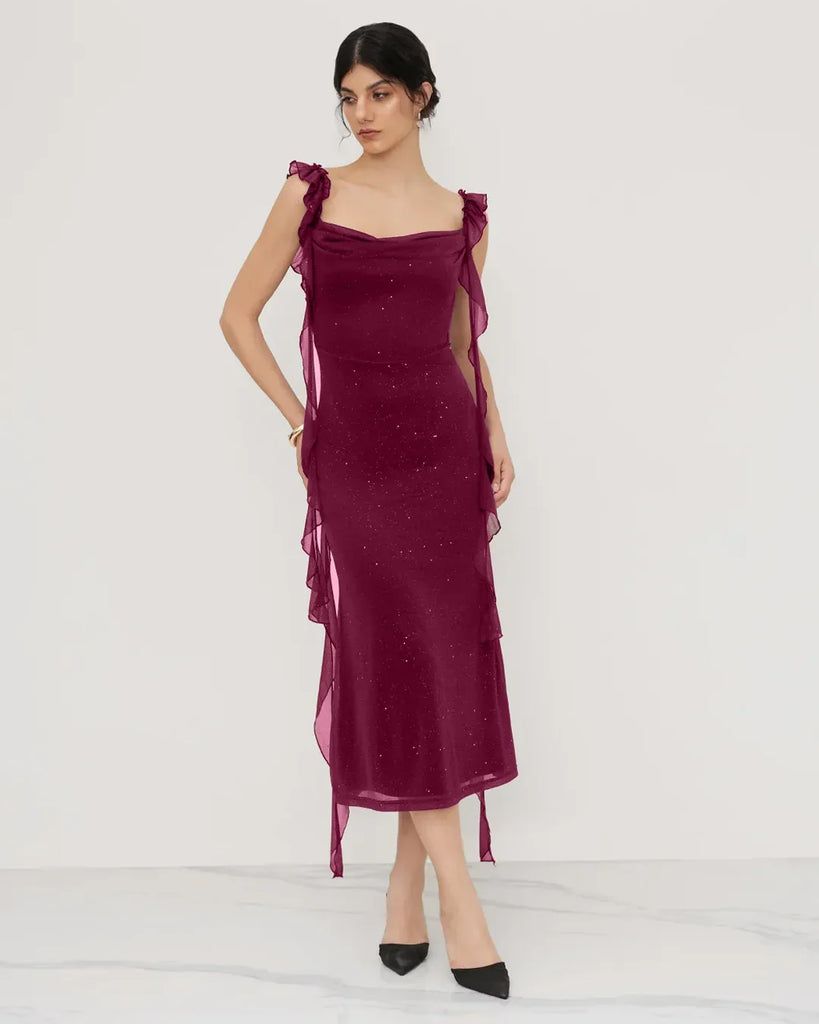 This bodycon midi dress is all about effortless elegance with a hint of drama. Designed with ruched detailing and side mesh ruffles, it flatters your shape while adding soft texture and flow. The sleek maroon tone gives it a bold yet refined edge, making it perfect for events that call for a confident, standout look. Crafted in a nylon-spandex blend, this dress hugs your curves comfortably while allowing easy movement.