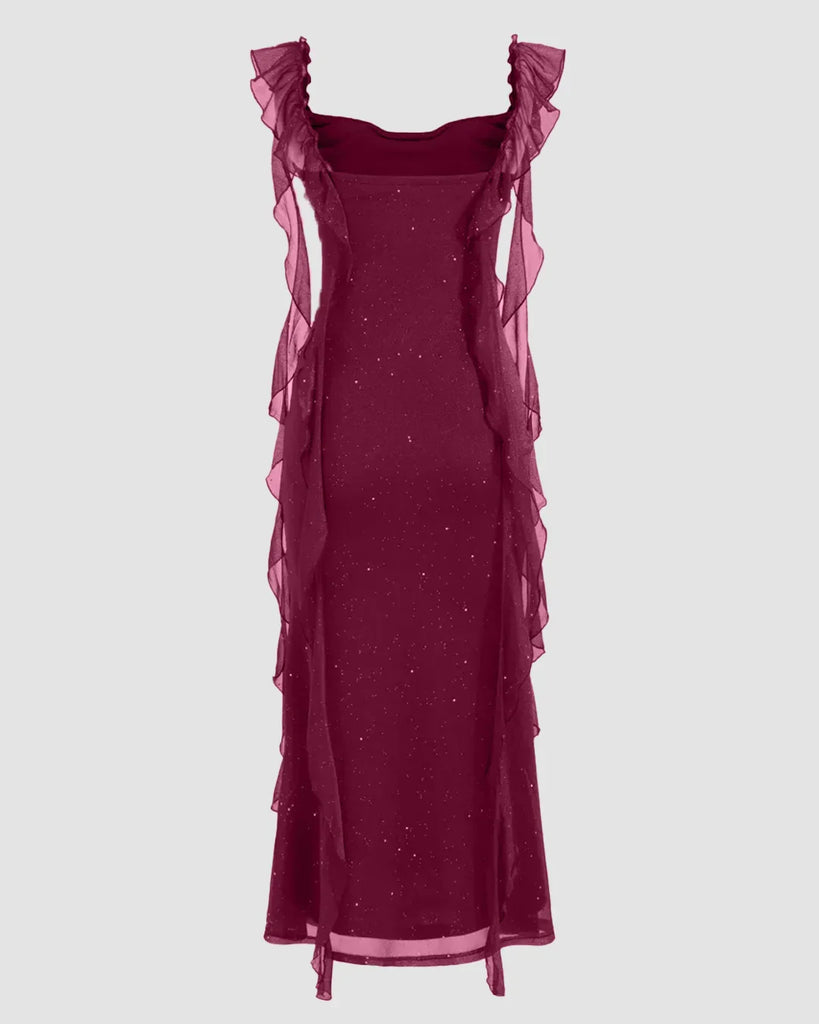 Maroon Ruched Ruffle Mesh Sleeveless Bodycon Midi Dress