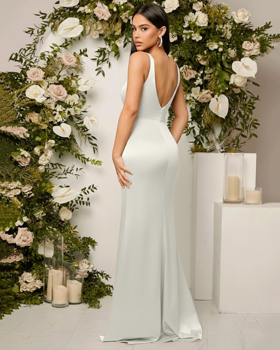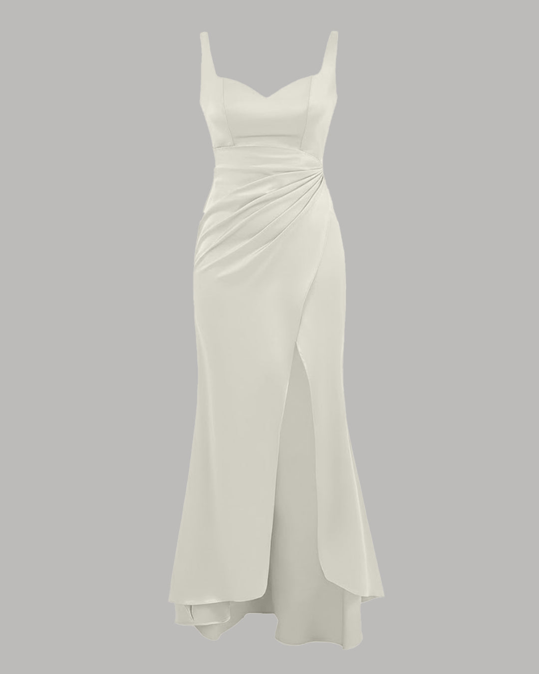 Off-White Satin Sweetheart Neck Ruched Wrap Slit Maxi Dress