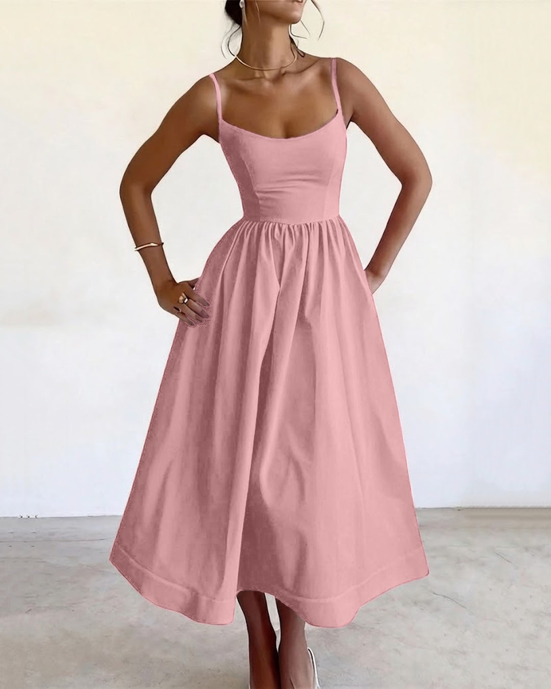 Powder Pink Spaghetti Strap Fit & Flare Midi Dress is made for those easy, graceful moments when you want to look put together without trying too hard. Designed with delicate spaghetti straps and a clean square neckline, this dress highlights the upper body while flowing out beautifully from the waist. The fit and flare silhouette creates a soft, feminine shape that feels light and comfortable all day.