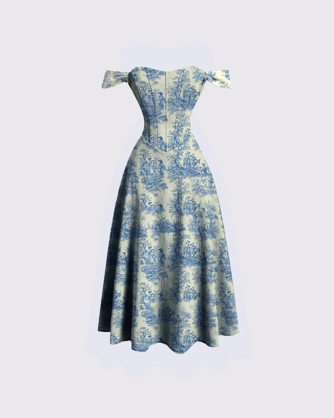 This romantic off-shoulder dress brings soft drama with a flattering, sculpted silhouette. Designed with an off-shoulder neckline, it highlights the shoulders while keeping the look feminine and elegant. The faux fishbone design adds subtle structure through the bodice, creating a cinched, corset-inspired shape without feeling stiff. Finished with a printed surface, this romantic off-shoulder dress feels elevated yet easy to wear. The flowy skirt balances the fitted top, giving it a graceful, timeless appeal that stands out without overdoing it.