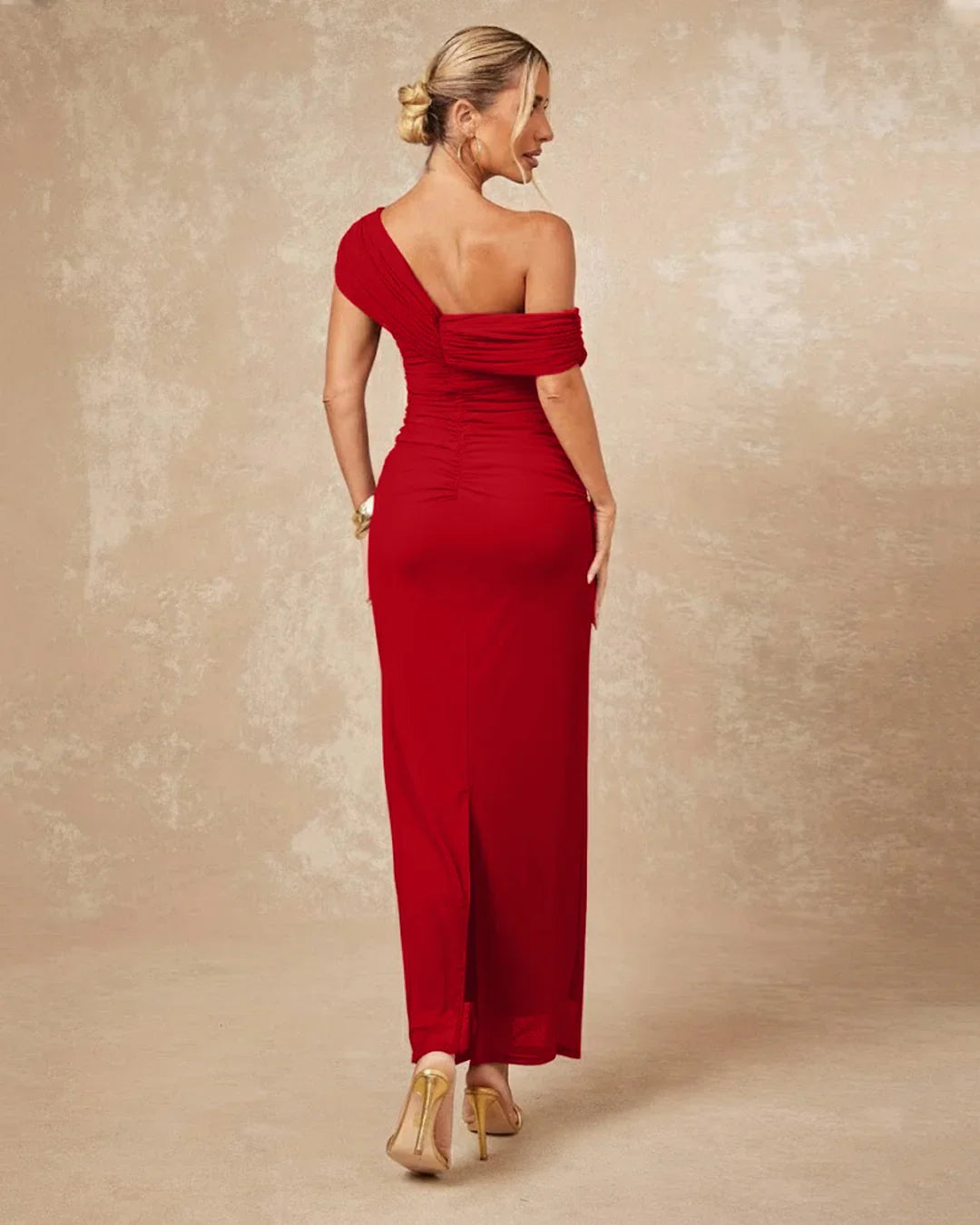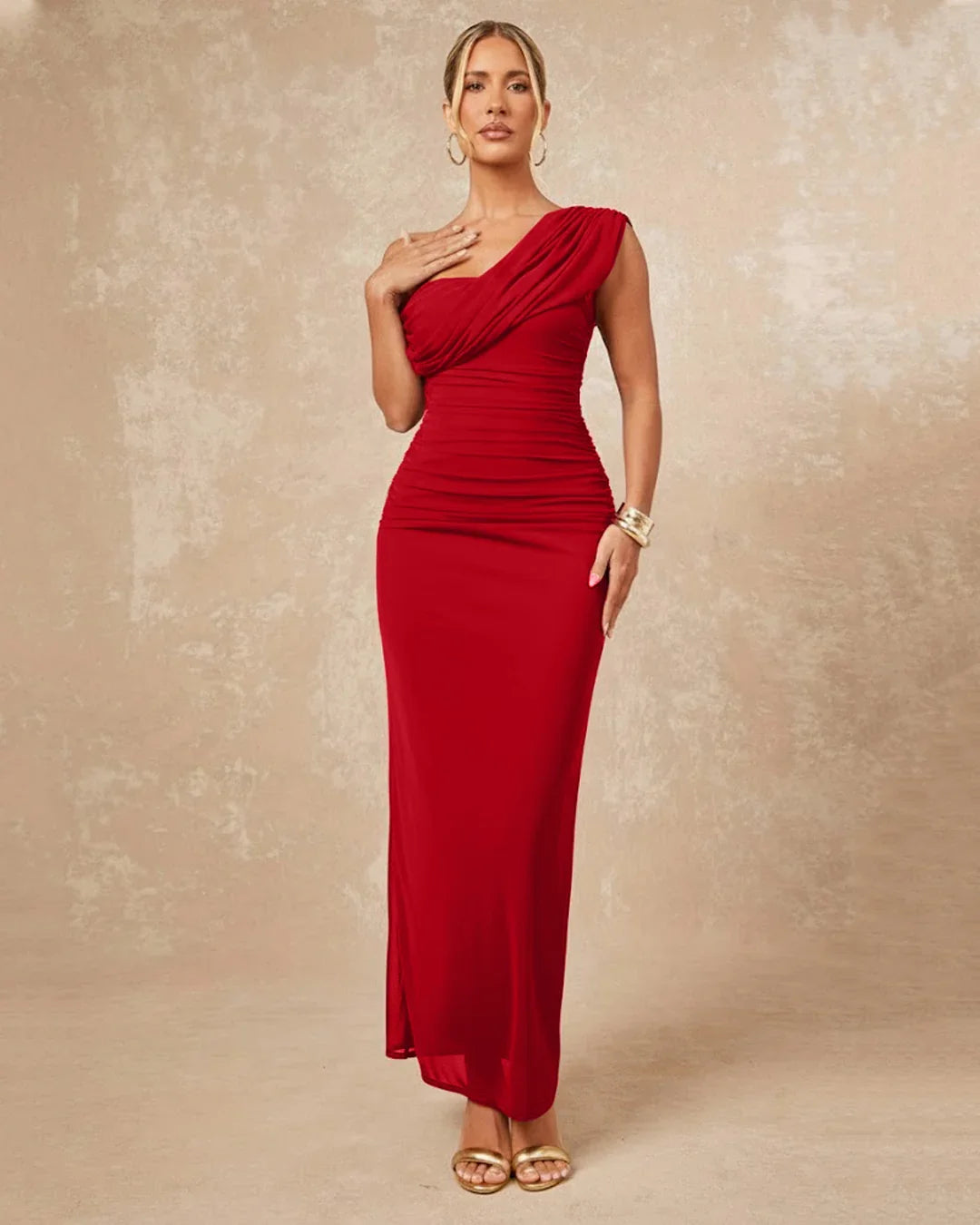 Red Asymmetrical Neck Ruched Bodycon Maxi Dress