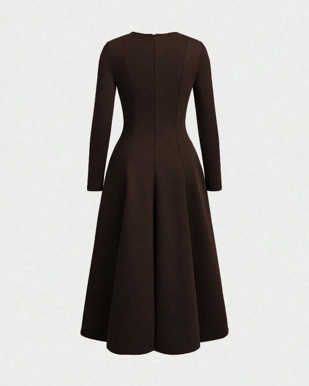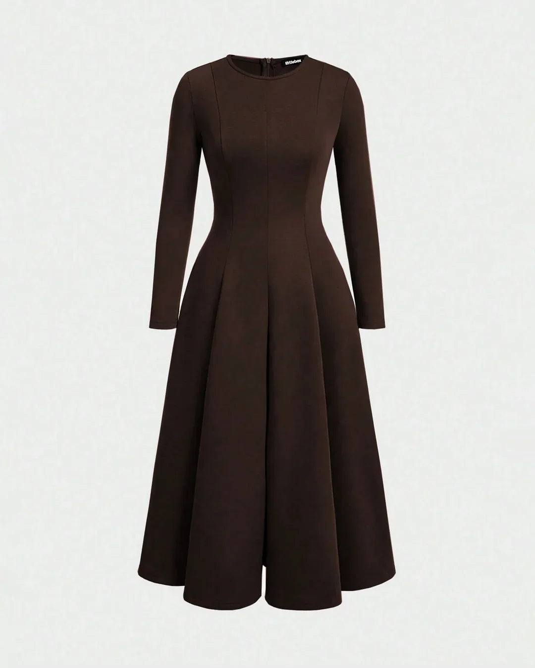 Round Neck Fit & Flare Solid Long Sleeve Midi Dress in Brown