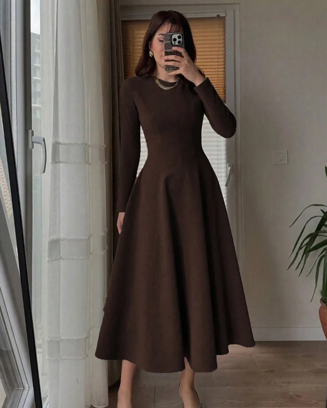 This fit and flare midi dress brings timeless style with a soft, flattering shape. Designed with a clean round neckline and long sleeves, it feels balanced and elegant without being too dressy. The fitted bodice flows into a gentle flare, creating an easy silhouette that moves beautifully as you walk. Crafted from smooth polyester, this fit and flare midi dress feels lightweight and comfortable while keeping its structure. The solid brown adds a warm, polished vibe that works across seasons and occasions.
