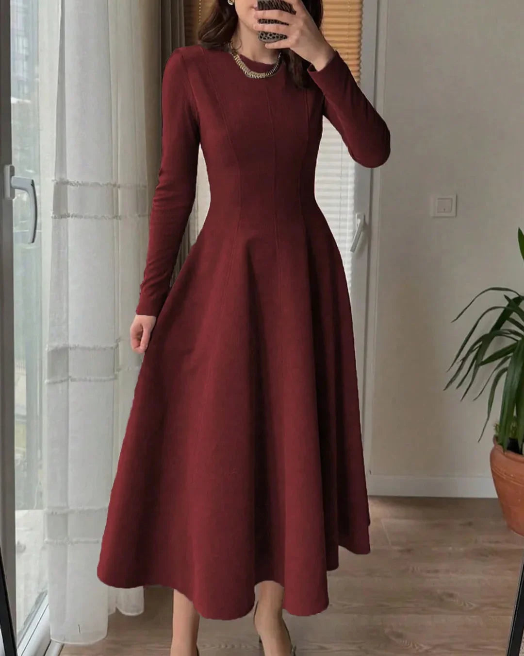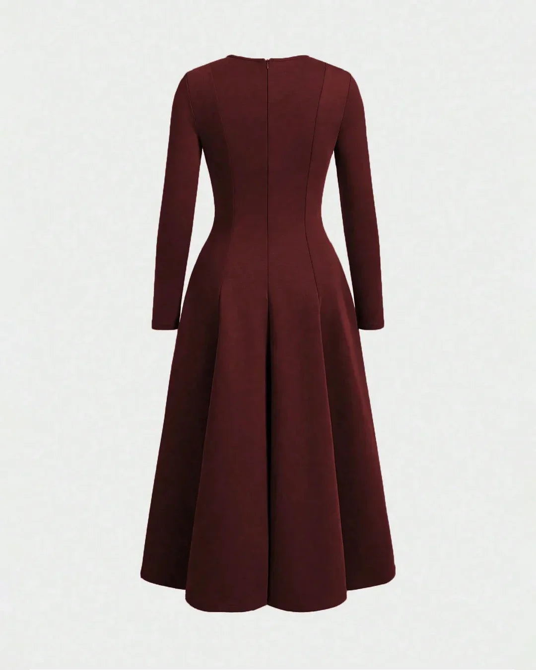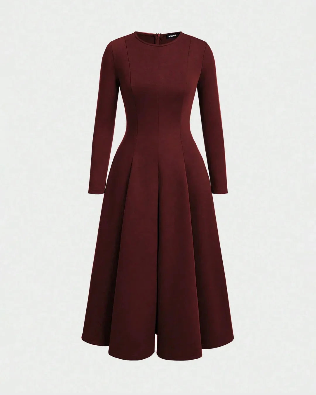 Round Neck Fit & Flare Solid Long Sleeve Midi Dress in Merlot