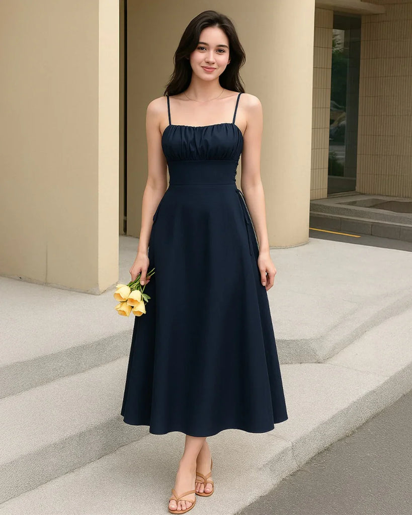 This spaghetti strap dress is the definition of simple and sweet. It’s designed with a softly ruched bust and lace-up sides that add charm without being too extra. The flowy A-line silhouette gives it that breezy, throw-on-and-go vibe while keeping your fit flattering and secure.