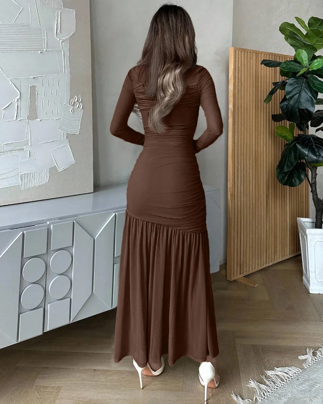 This full sleeve midi dress is designed to give a sleek, sculpted look with a soft feminine finish. The fitted bodice hugs the body comfortably, while the gentle ruching adds texture and shape without feeling heavy. Finished with a flowy ruffle hem, it brings movement and balance to the silhouette. The coco colour adds a warm, rich tone that feels elevated yet wearable. Made with stretch fabric, this full sleeve midi dress feels smooth on the skin and stays flattering through the day or night.