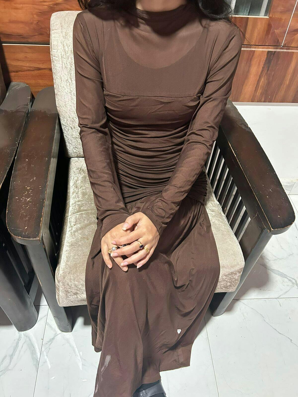 Ruched Full Sleeve Bodycon Midi Dress in Red