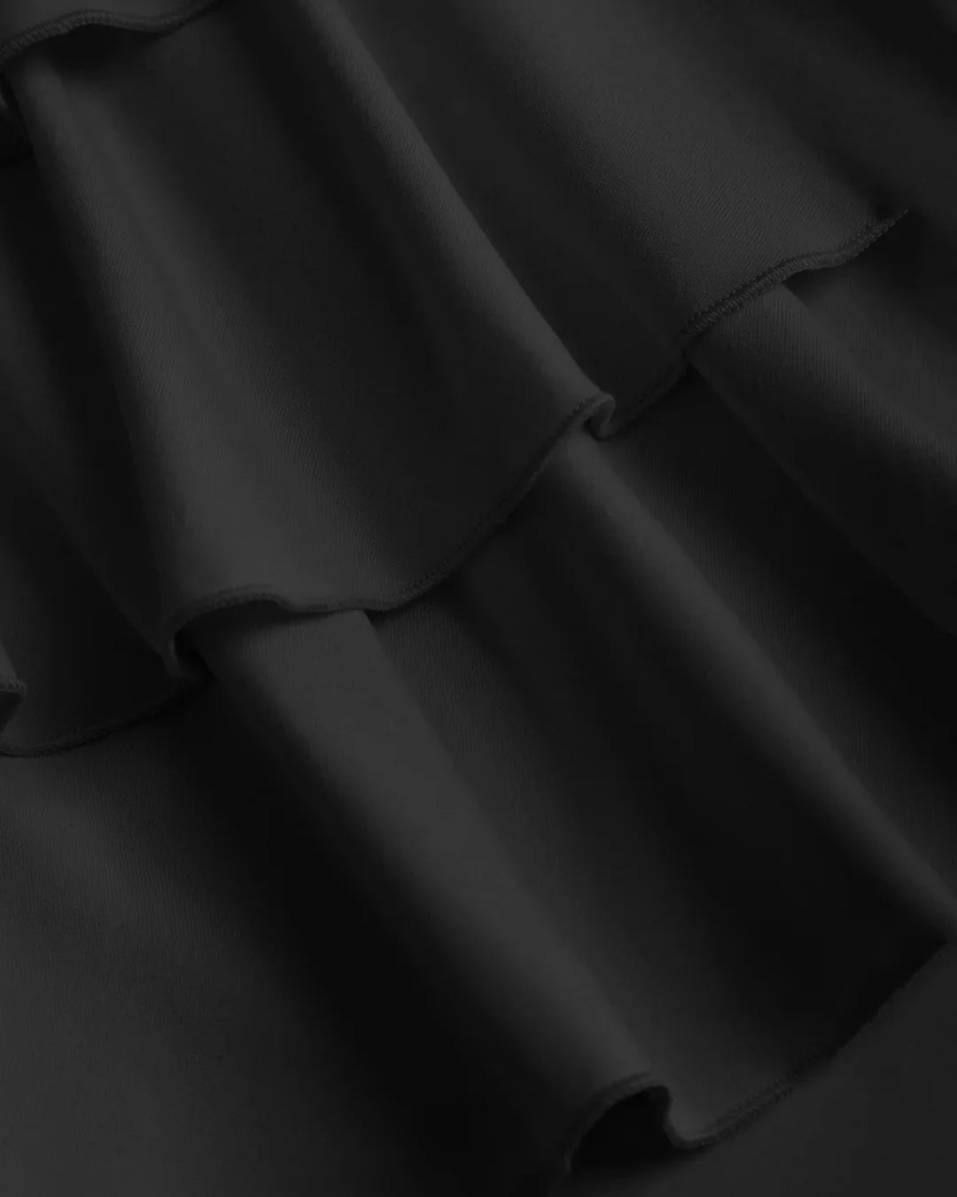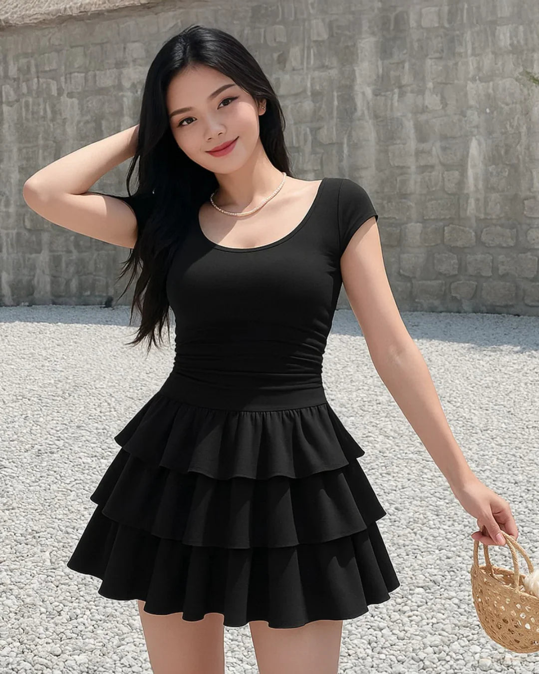 This ruffle mini dress is all about playful structure with a clean, fitted feel. Designed with a smooth round neckline and cap sleeves, it features a cinched waist that flows into soft layered ruffles for added movement. The black tone keeps it sharp and versatile, while the flared mini length adds a fun, confident edge. The fabric feels light yet holds shape well, making the ruffle mini dress easy to style and easy to wear.