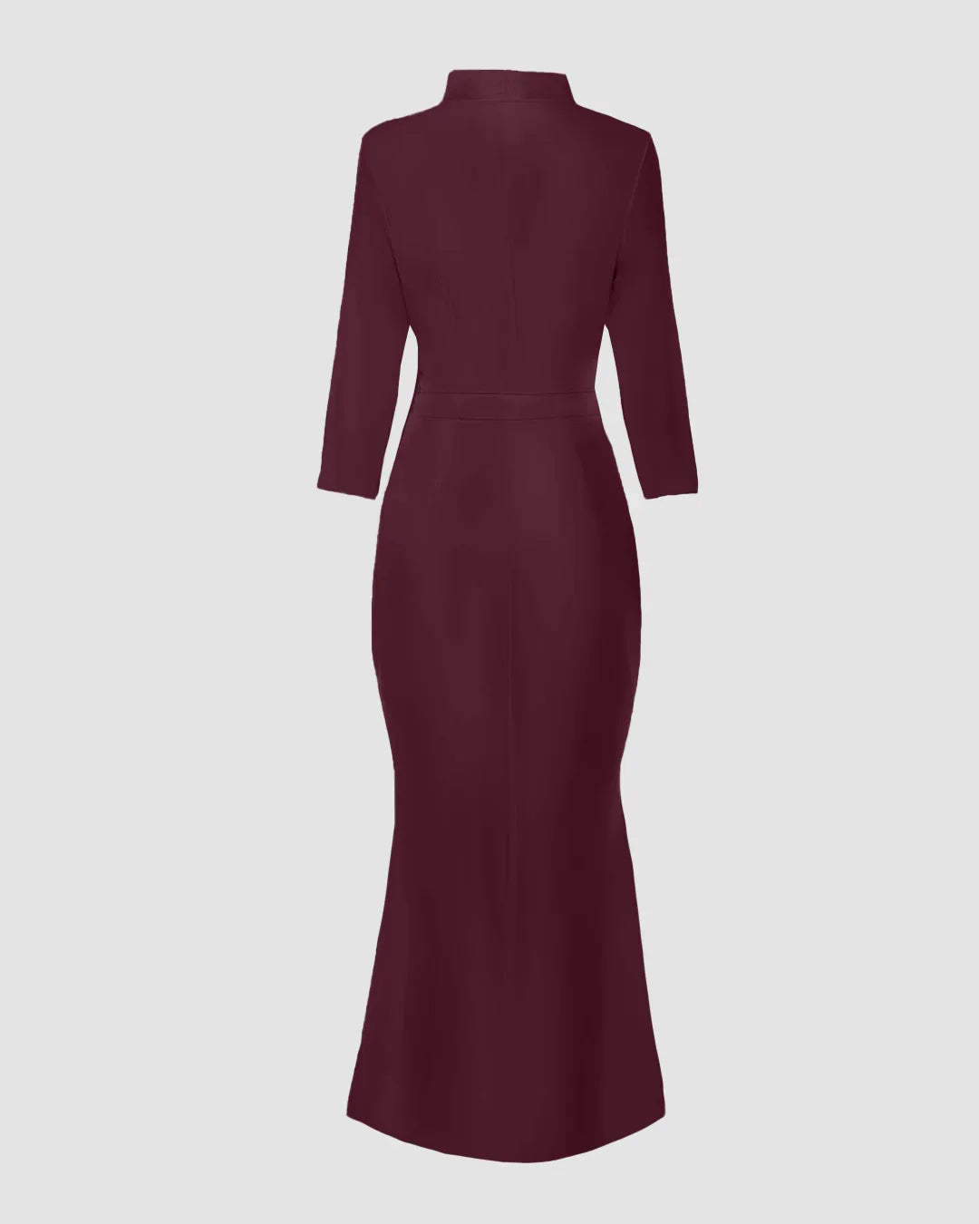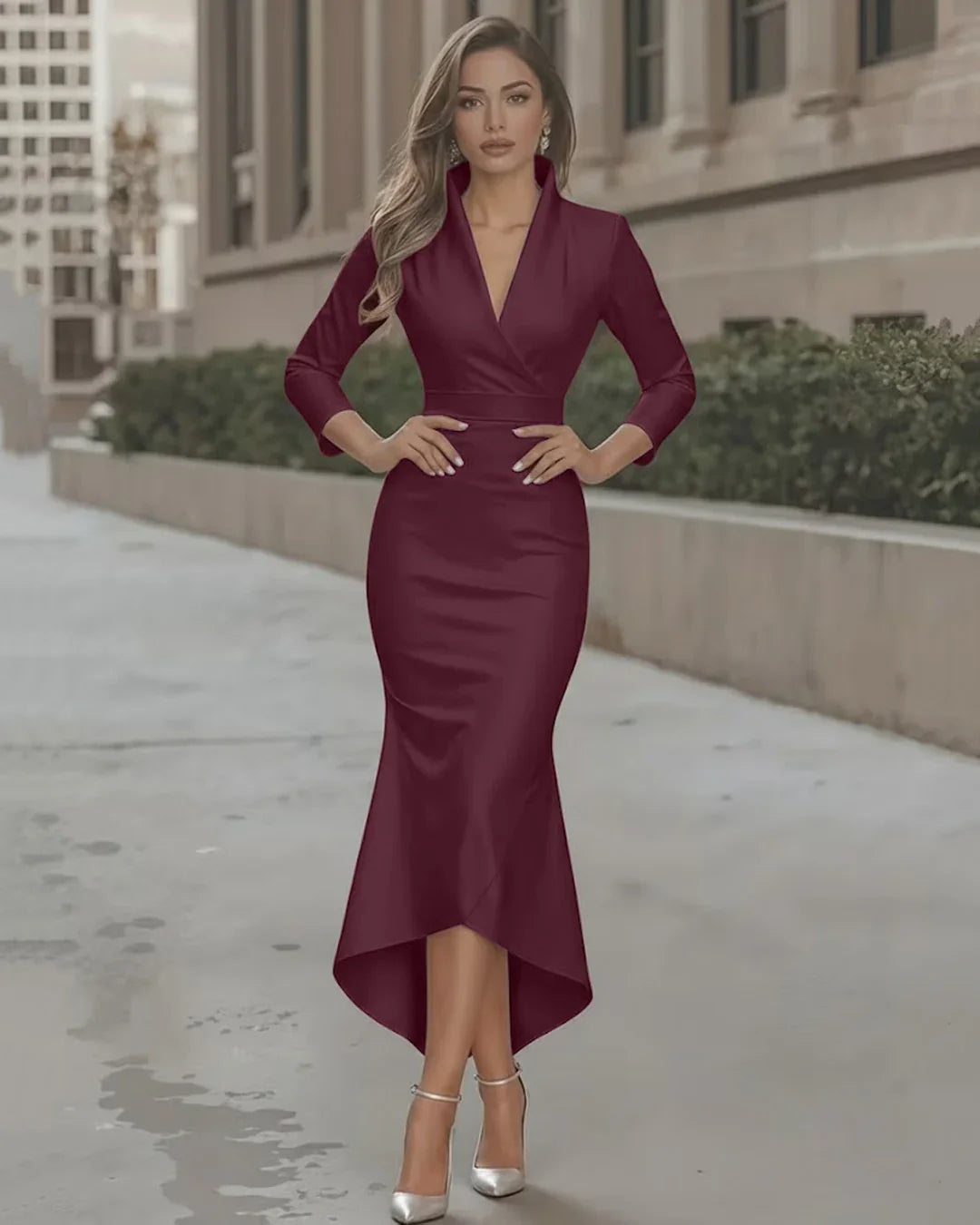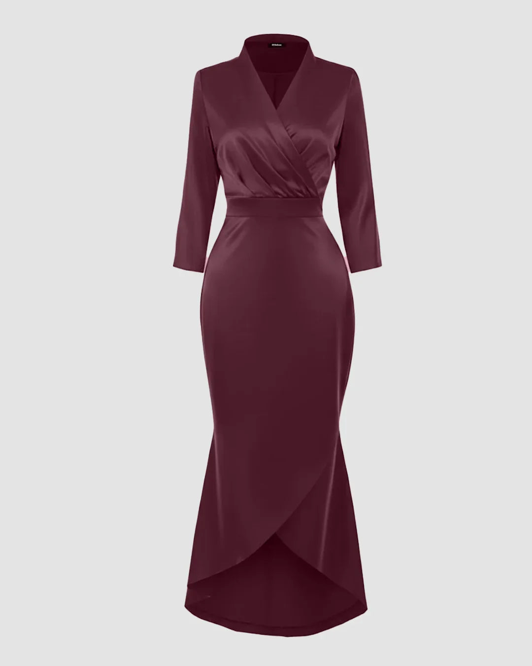 Satin V-Neck Waist-Tapered Mermaid Dress with High-Low Hem in Maroon is designed for moments when you want a clean, confident silhouette that speaks for itself. This mermaid dress features a sharp V-neckline paired with a waist-tapered fit that naturally highlights your shape without feeling restrictive. The smooth satin finish adds a soft sheen, while the high-low hemline brings subtle drama and graceful movement with every step. Structured yet fluid, this mermaid dress feels elegant without trying too hard.