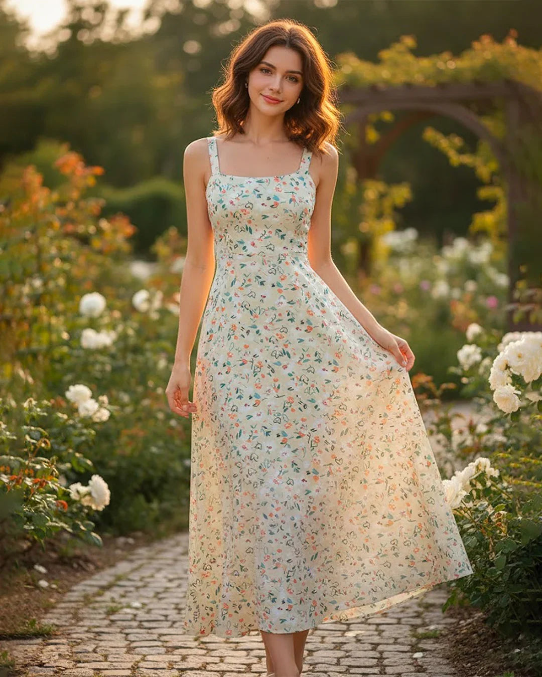Sleeveless Square Neck Fit & Flare Floral Maxi Dress is all about soft details and easy elegance. Designed with a flattering square neckline and a gently fitted bodice, this floral maxi dress flows into a breezy flared skirt that moves beautifully with every step. The delicate floral print adds a fresh, romantic feel, while the lightweight fabric keeps it comfortable and airy. This floral maxi dress feels balanced, feminine, and perfect for days when you want to look styled without trying too hard.
