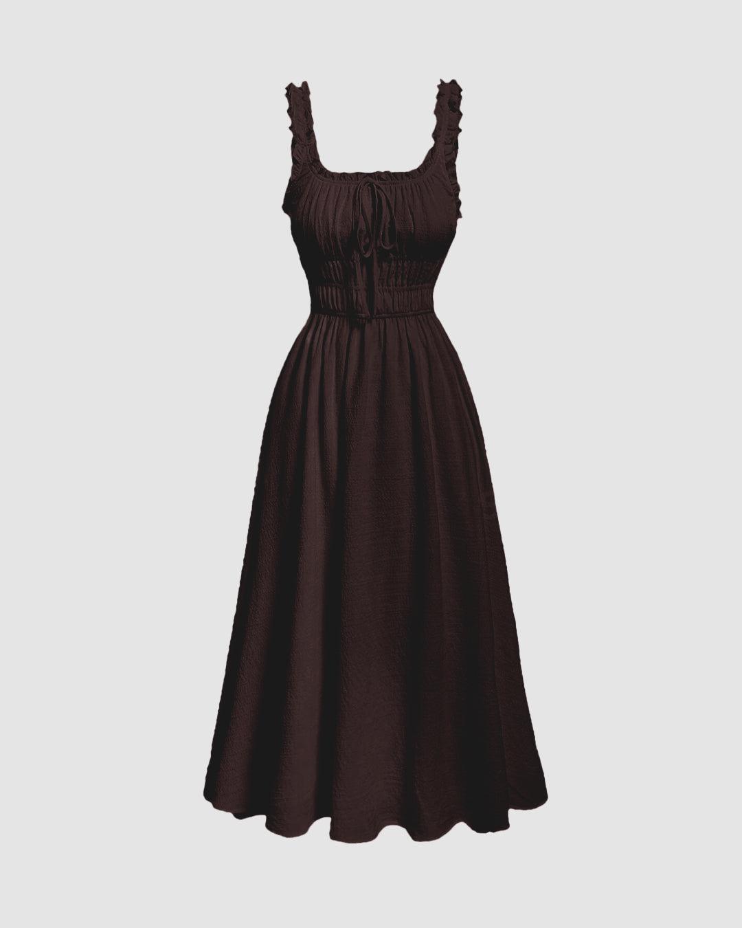 Solid Frill Trim Tie Front Chocolate Brown Midi Dress