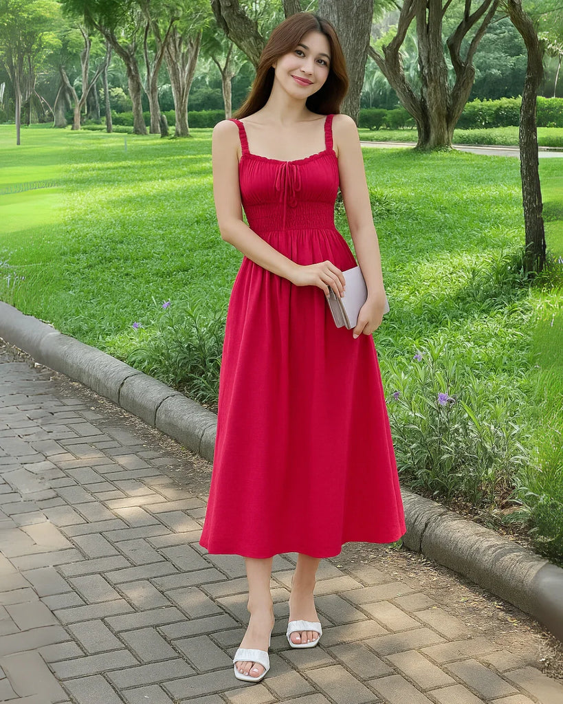 This hot pink dress is the pop your wardrobe’s been waiting for. With cute frill straps, a ruched bust, and a flattering tie front, it gives instant cottagecore vibes. The flowy fit and comfy fabric make it perfect for chill hangs or weekend plans.