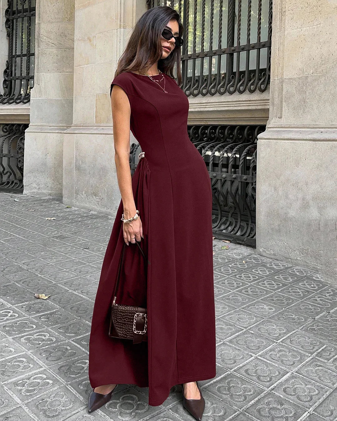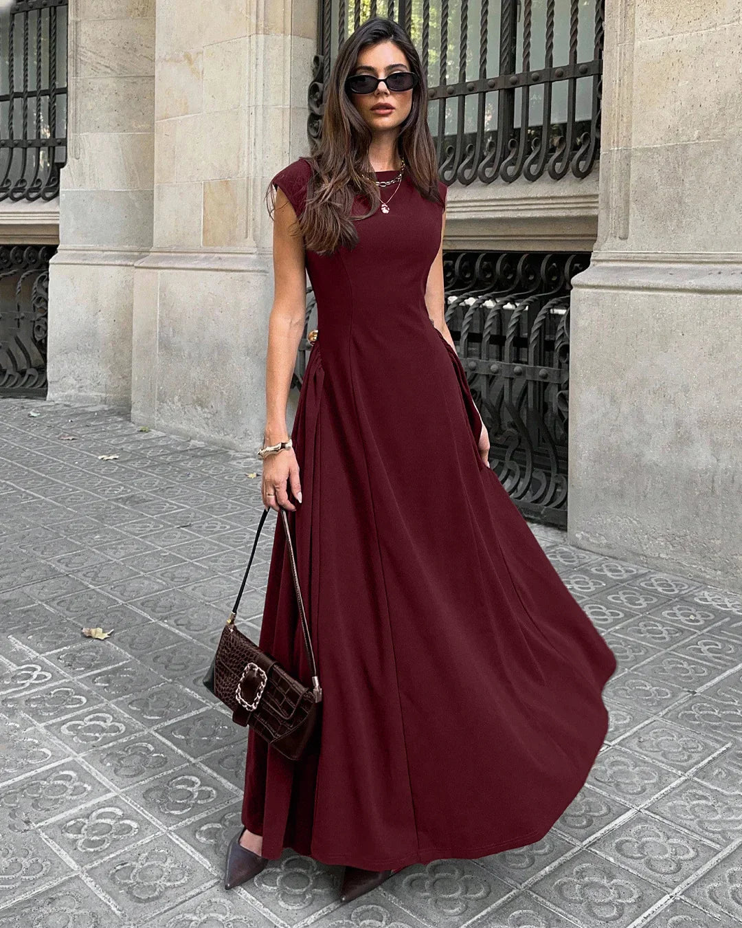 • Day look: Style the fit & flare maxi dress with flats and a sling bag for an easy daytime outfit.