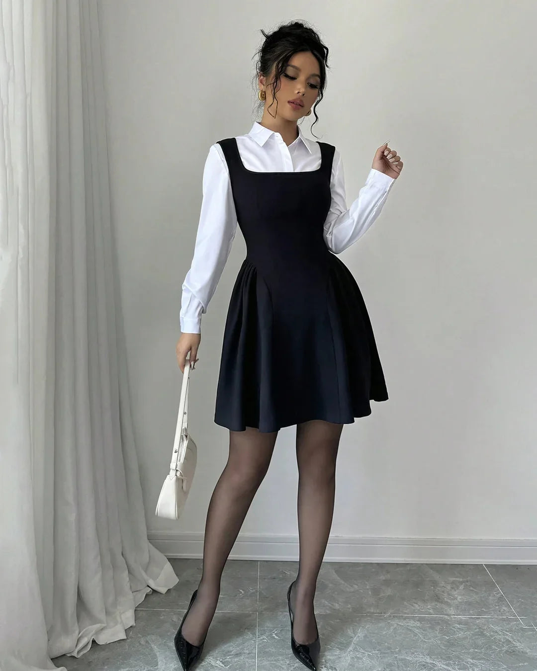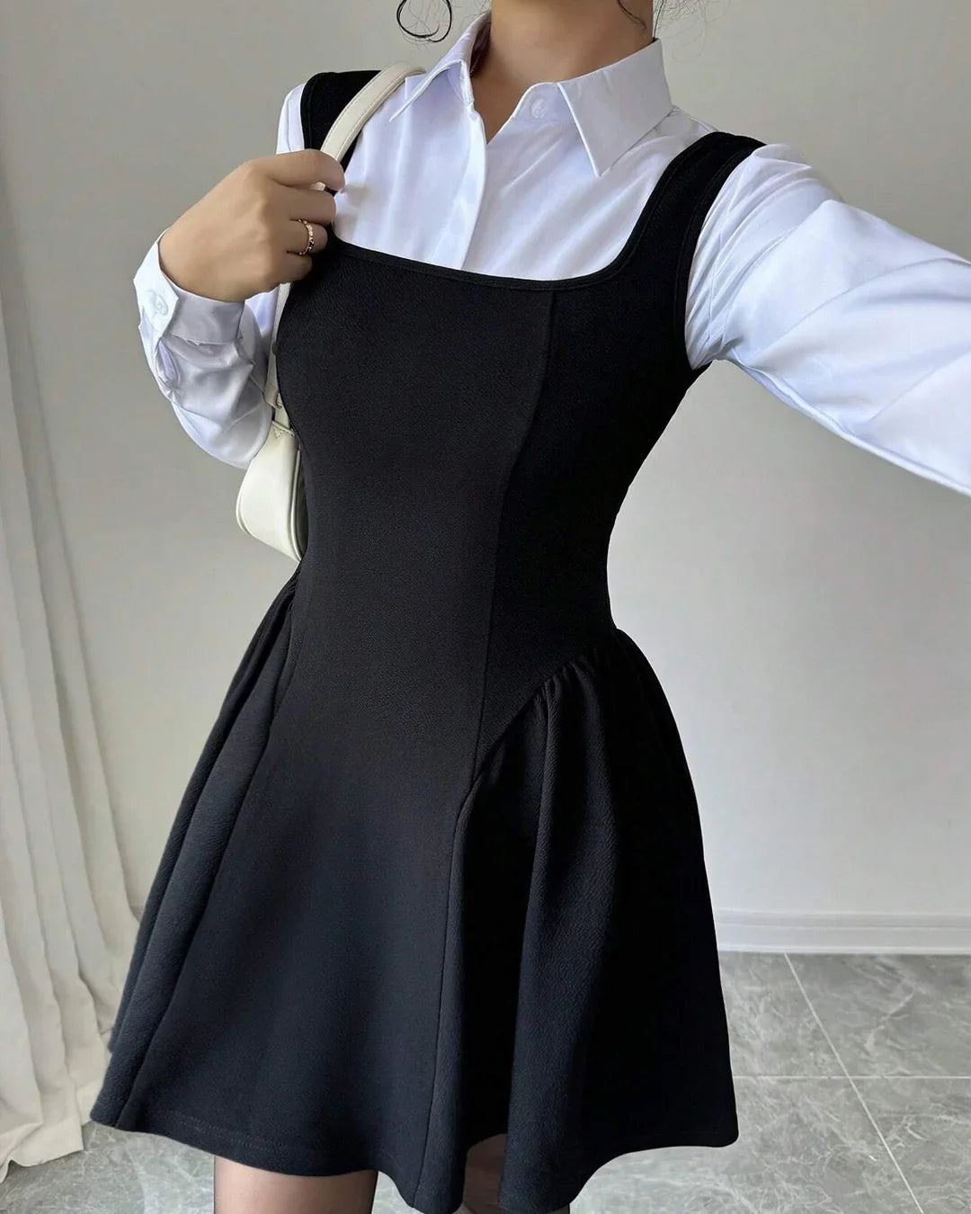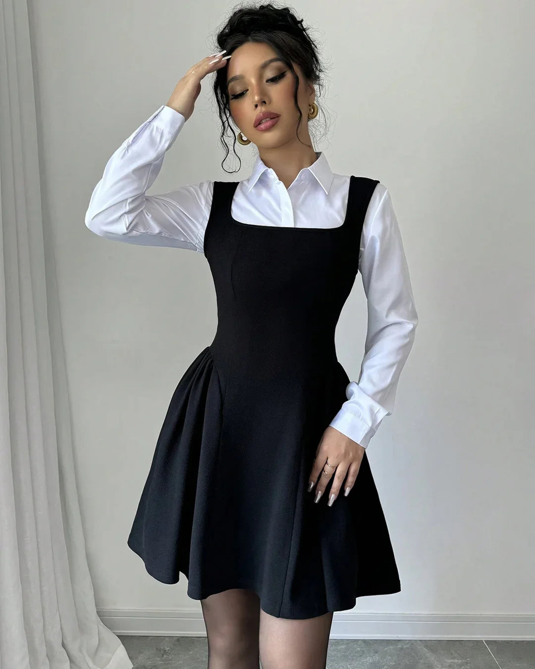 This dress set gives you an instantly styled look with zero effort. Featuring a square neck A-line mini dress layered over a classic white collared shirt, it blends structured tailoring with a soft, feminine silhouette. The ruched hem detail adds subtle shape and movement, while the layered design creates a chic, put-together vibe that works for multiple occasions.