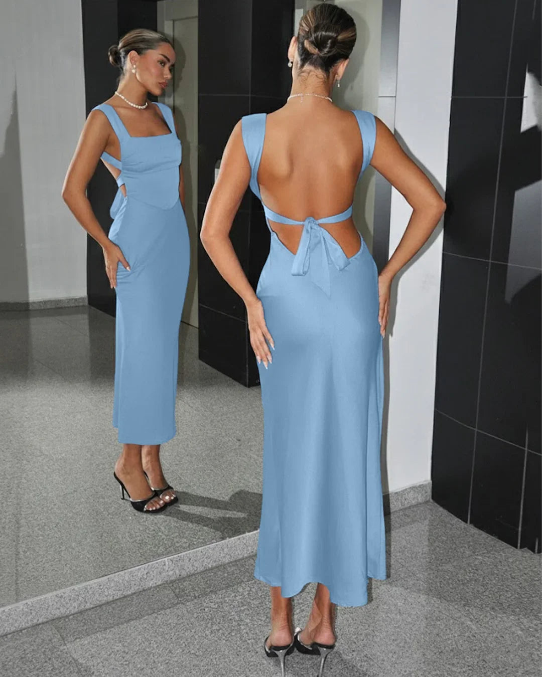 Square Neck Backless Satin Maxi Dress in Powder Blue