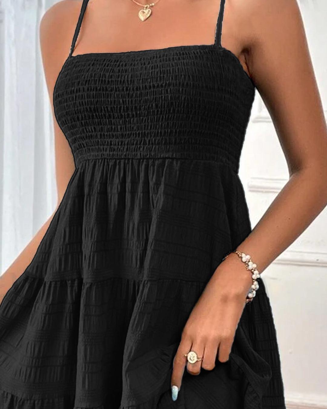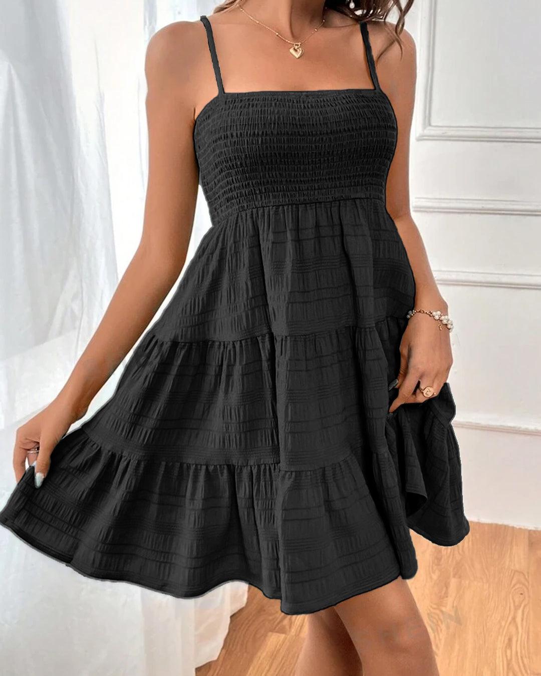 The black beach dress you’ll reach for all summer long. With its smocked bodice, flared tiered skirt, and barely-there spaghetti straps, it’s made for golden hours and chill breezes. Lightweight and flowy, it gives that effortless vibe you want on sunny getaways or chill cafe dates.