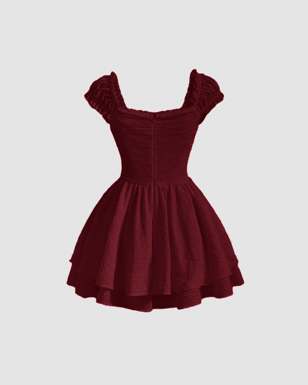 Say hello to the Square Neck Textured Waist-Cinching Maroon Dress – a cute and stylish outfit for casual hangouts, date nights, or fun days out. This mini dress has a fitted waist and a flowy layered skirt that makes it super flattering.