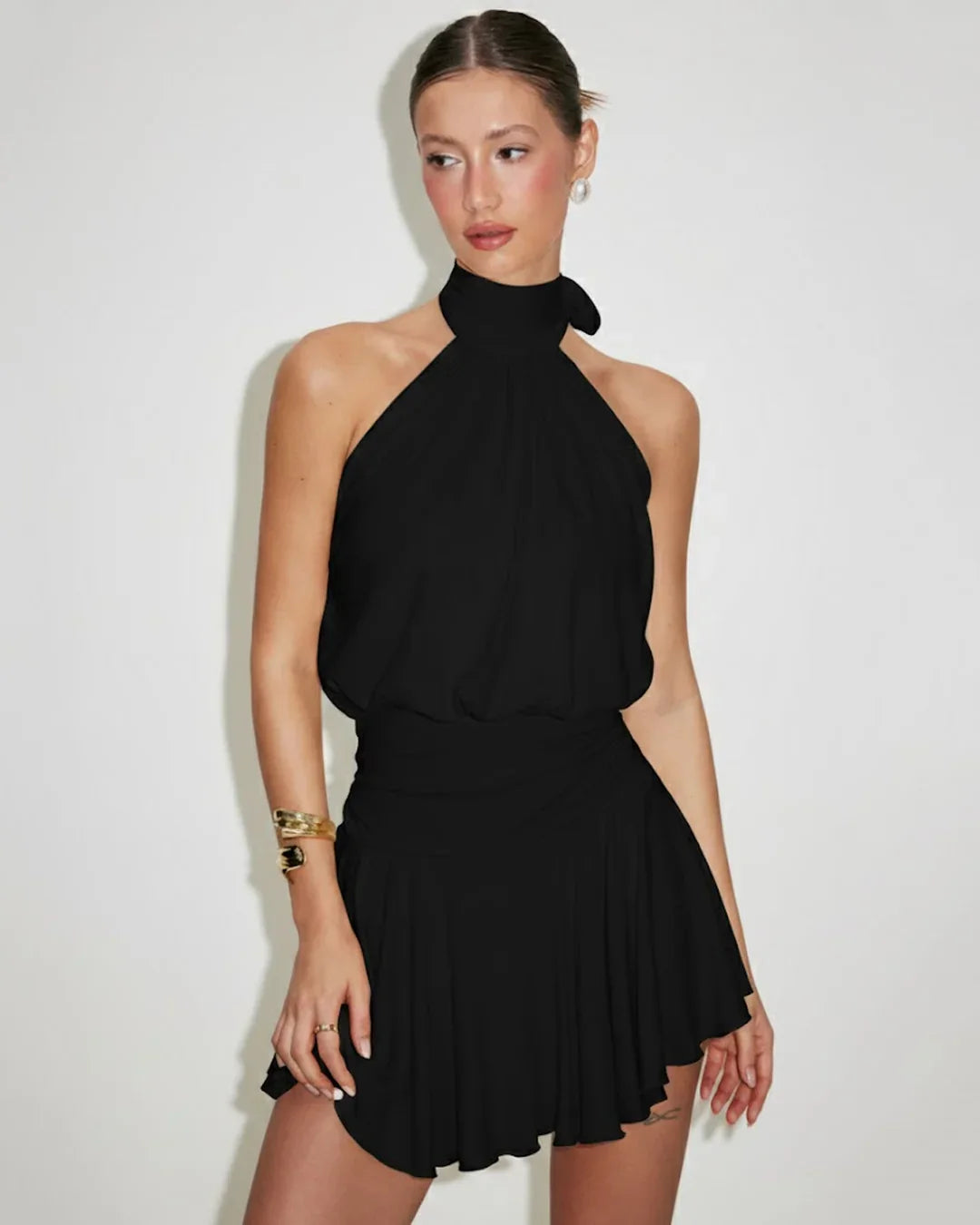 Stand Collar Sleeveless A-Line Mini Dress is designed for effortless elegance with a modern twist. The structured stand collar gives it a refined look, while the soft gathered bodice adds gentle volume and movement. The sleeveless cut keeps it light and breezy, making it perfect for warm days or layered styling.