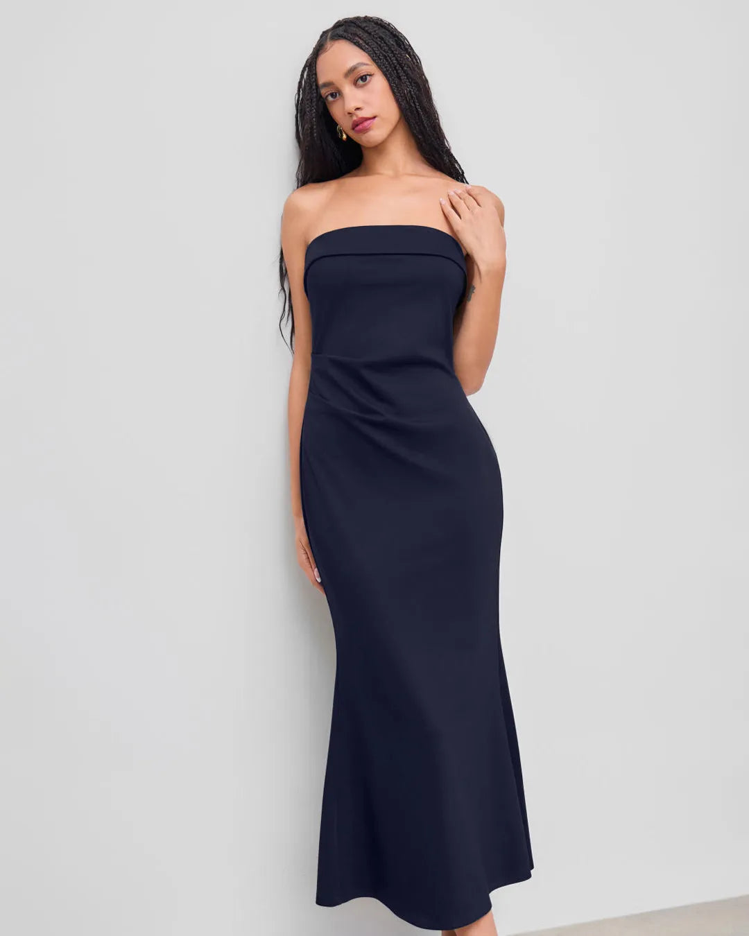This tube bodycon dress is sleek, minimal, and made for clean statement looks. Designed with a strapless neckline and a smooth fitted silhouette, it hugs the body without feeling too tight. The navy blue shade adds a polished edge, making the tube bodycon dress feel classy and versatile. Soft stretch fabric keeps the fit comfortable while holding its shape nicely. Subtle ruching at the waist adds definition and keeps the look flattering from every angle.