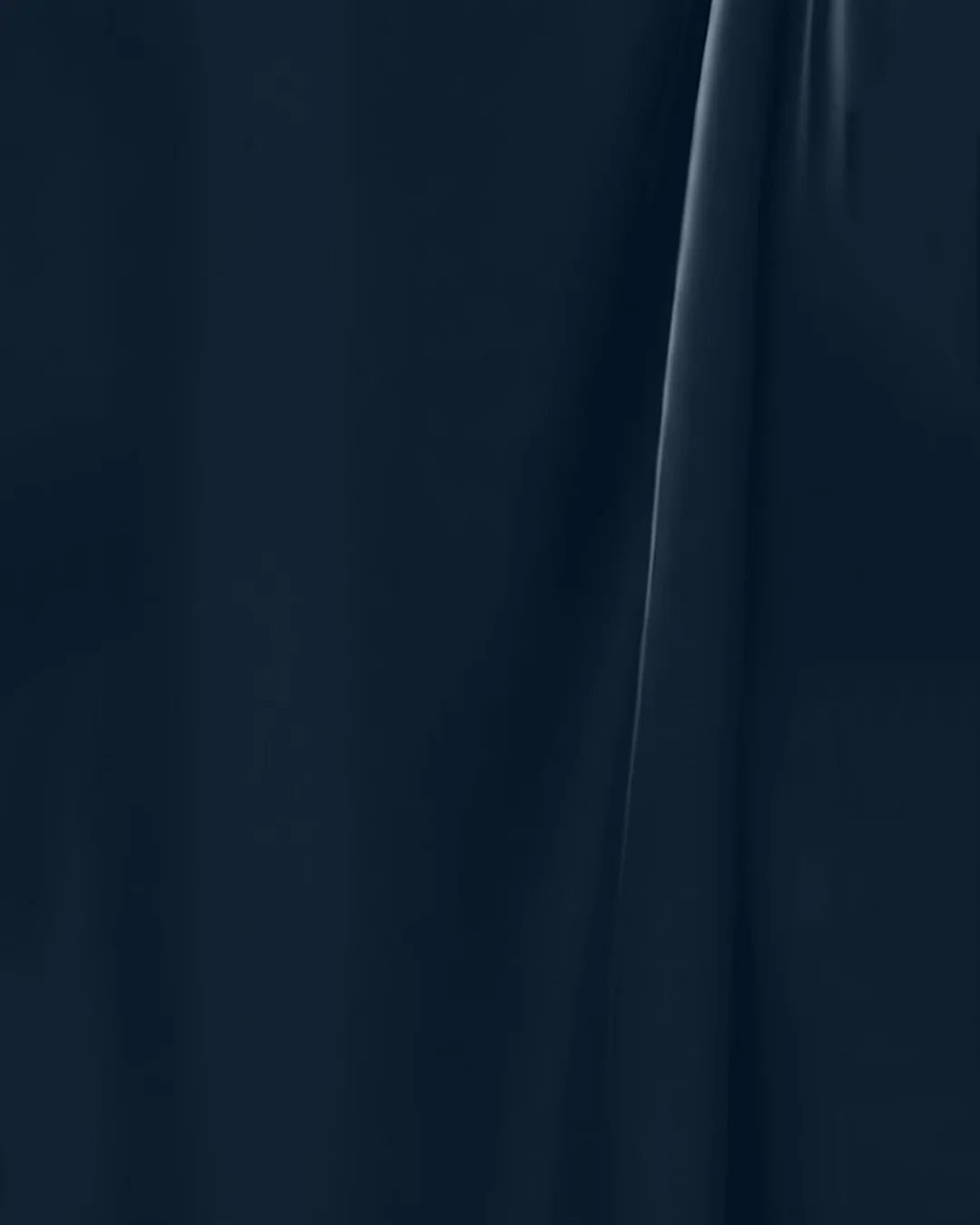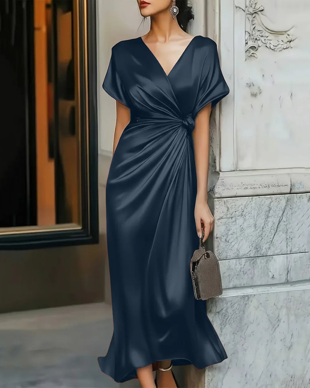 V-Neck Flared Hem Short Sleeve Frilled Waist Midi Satin Dress in Navy Blue