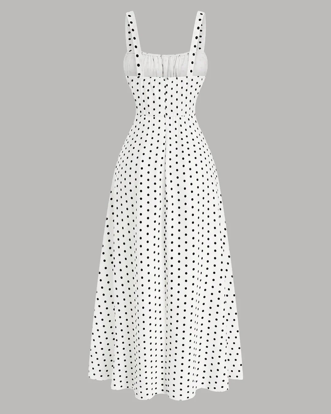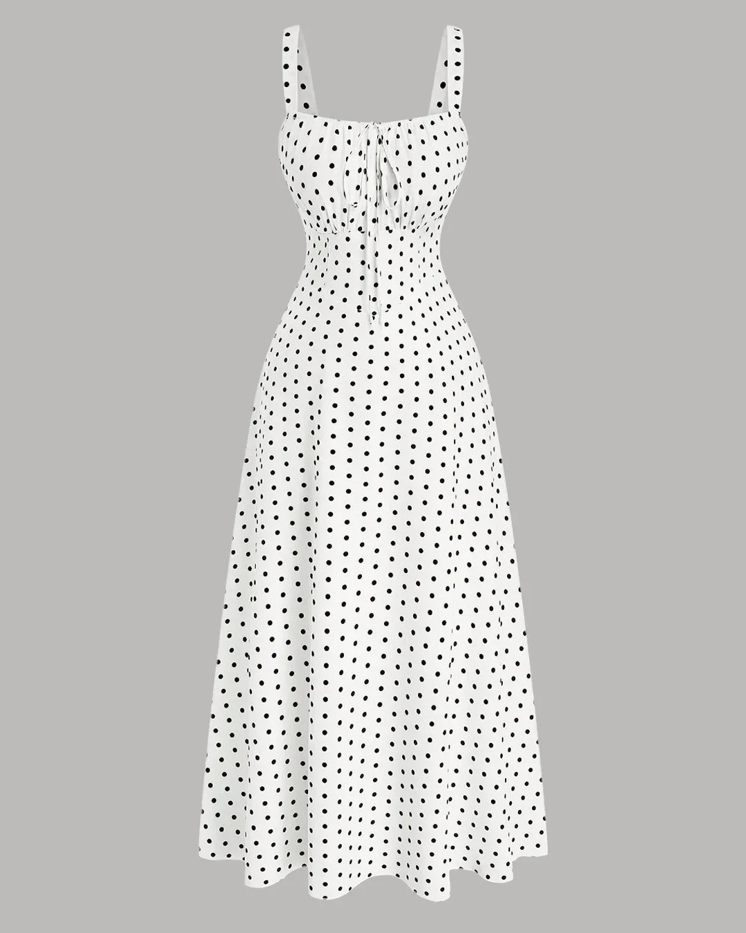 White Polka Dot Dress in white polka dot is a classic pick that feels light, feminine, and easy to wear. Designed with a fitted bodice and a softly flared skirt, this dress creates a flattering shape while keeping things comfortable and breathable. The delicate polka dot pattern adds a playful touch, while the clean straps and gathered detailing at the bust keep the look balanced and elegant.