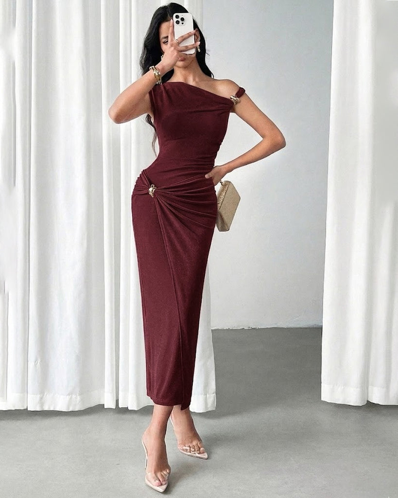 Metal Buckle Decor Slim Fit Maxi Bodycon Dress in Maroon