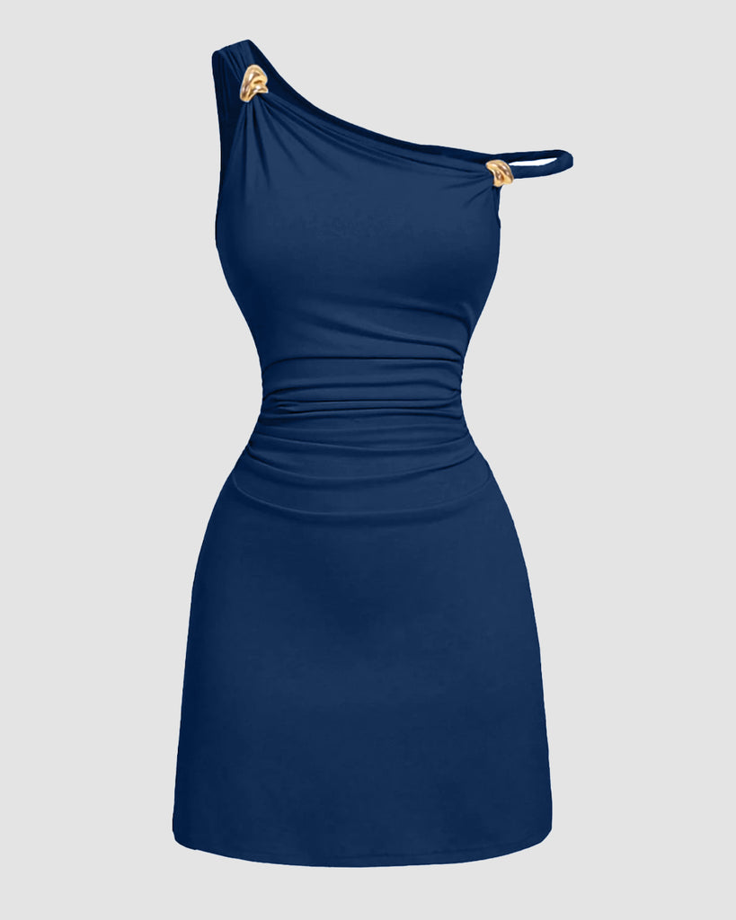 Fitted Pleated Metal Buckle Mini Dress in Blue