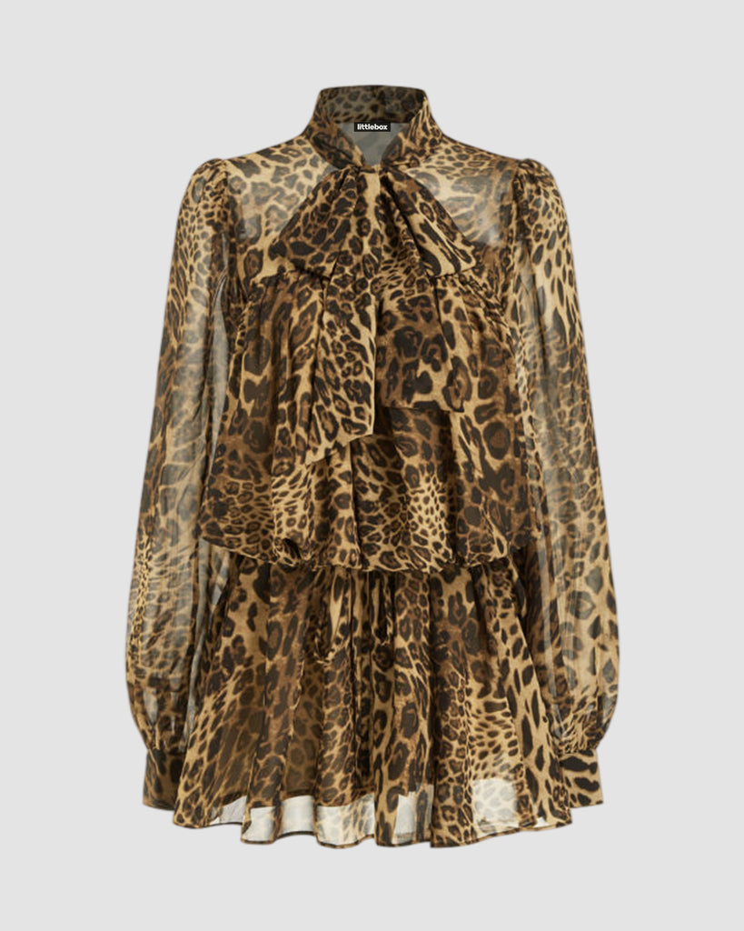 Leopard Print Stand Collar Ruffled Babydoll Mini Dress