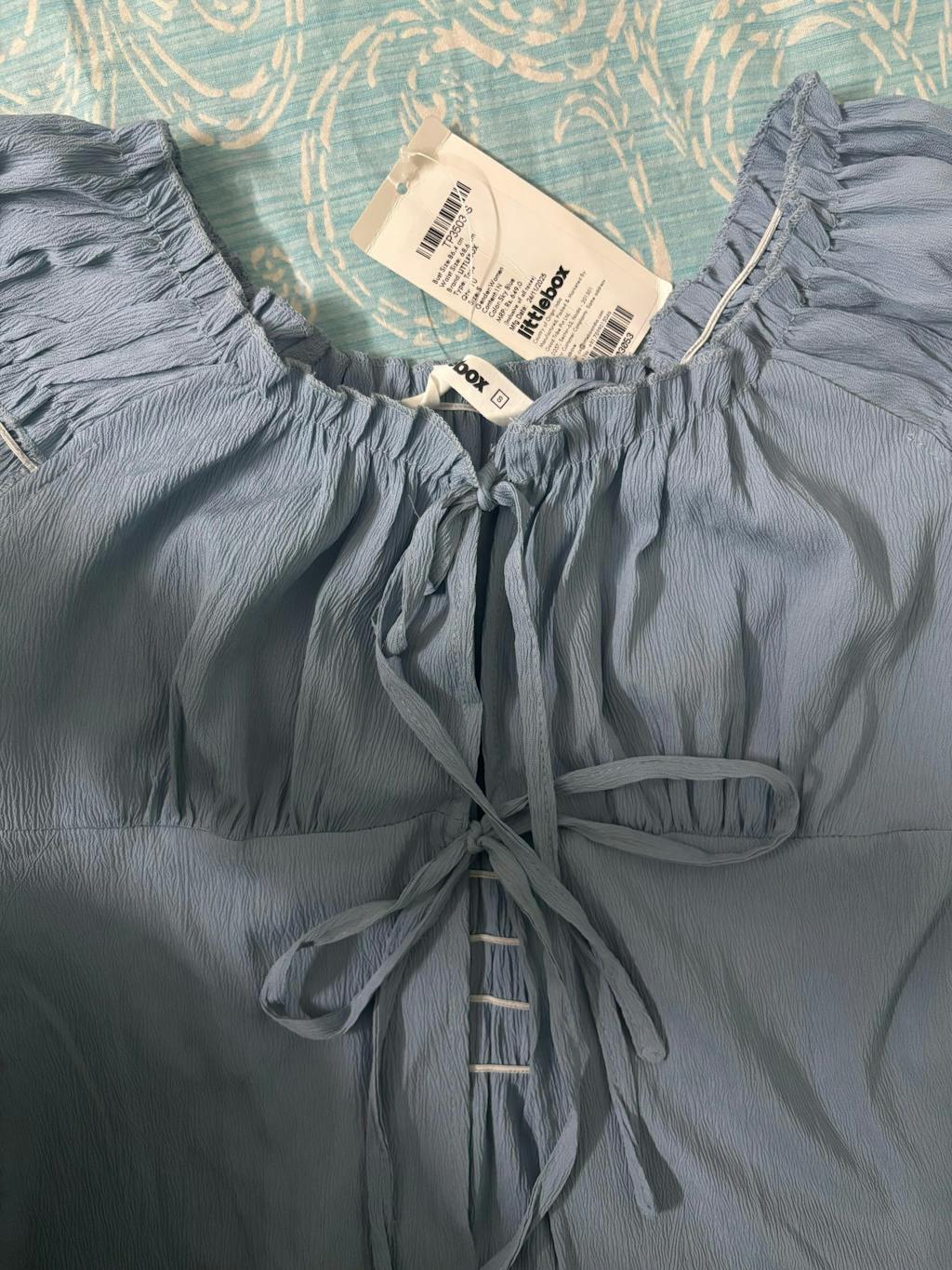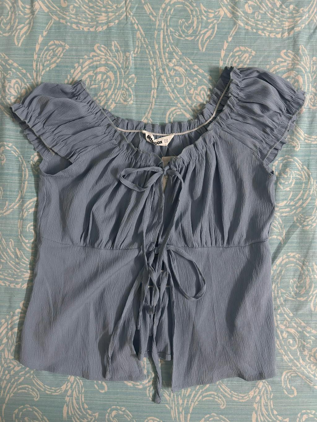 This puff sleeve crop top brings a soft, romantic feel with a flattering fitted shape. Designed with an off-shoulder neckline and gentle gathers at the bust, it frames the shoulders nicely while keeping the look light and feminine. The tie-up detail at the front adds a playful touch and allows slight adjustment for comfort. Puff sleeves add volume and balance, giving the silhouette a cute, airy vibe. Finished in a calm blue tone, this puff sleeve crop top feels fresh, stylish, and easy to wear. Made from a stretch-blend fabric, it feels smooth on the skin and moves comfortably with the body.