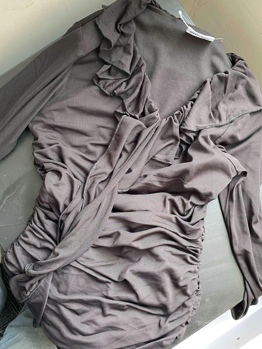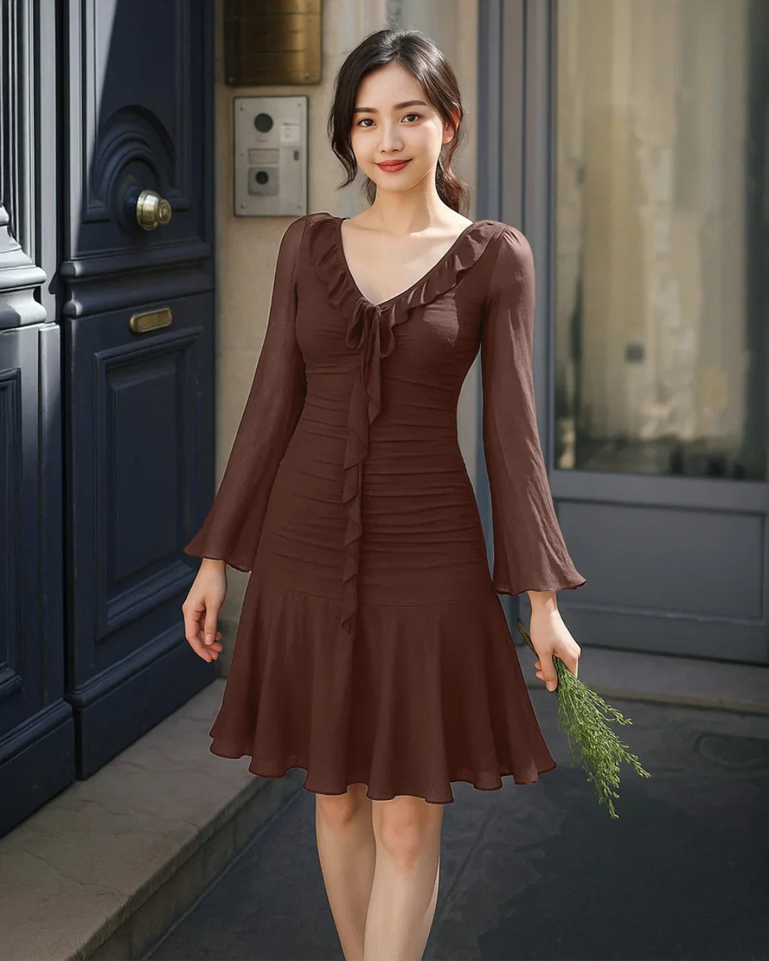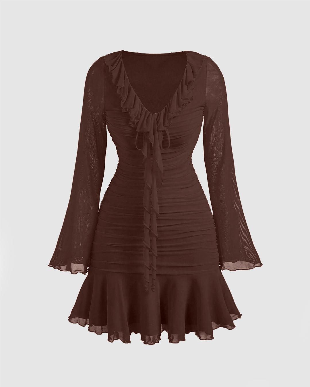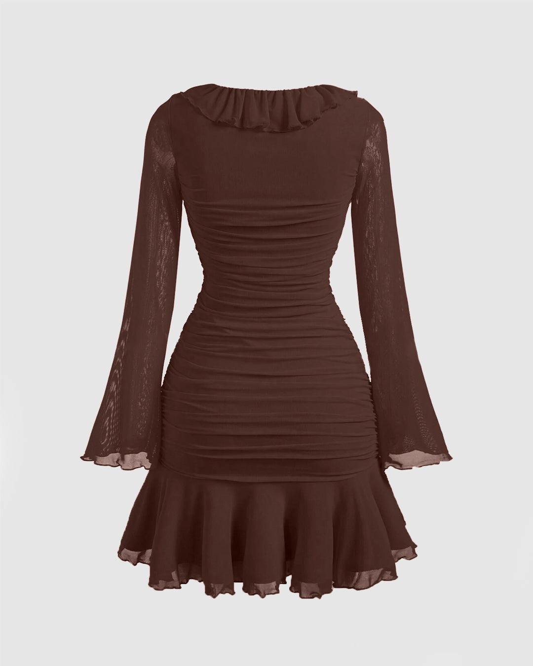Brown Ruffle Hem Mini Dress with Long Sleeves