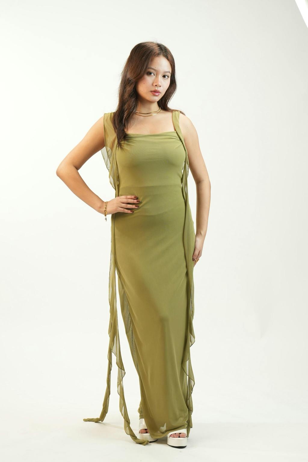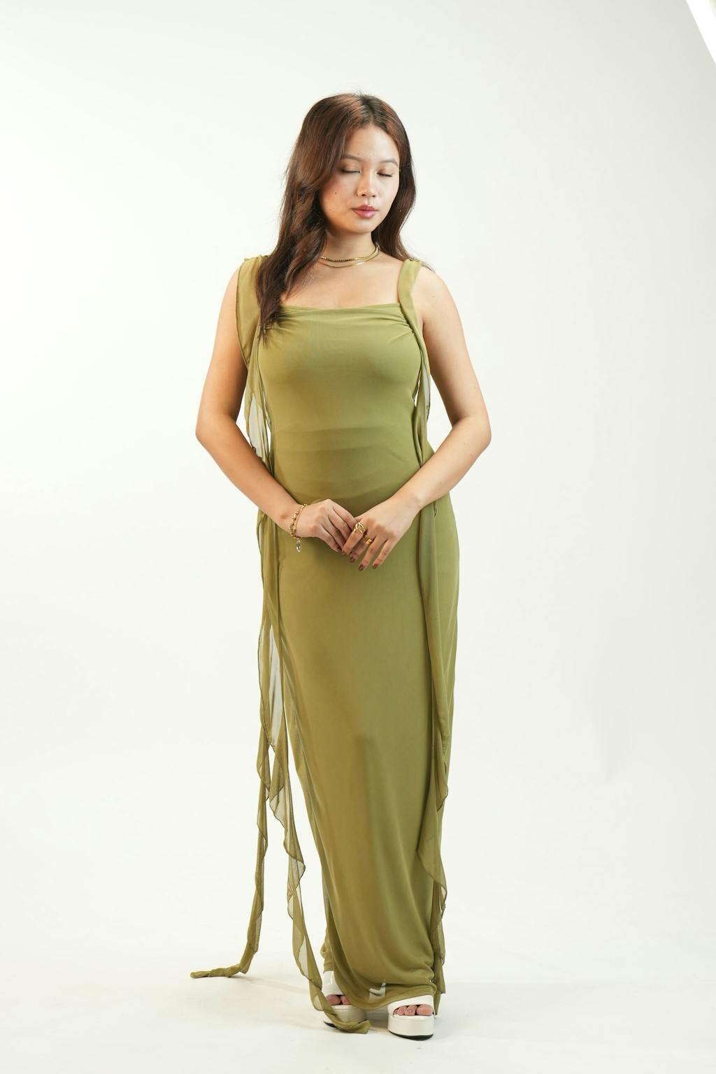 Step into the limelight with the Mesh Ruffle Green Maxi Dress, made for women who love to set trends, not just follow them. This maxi dress comes with pretty ruffle details on the sides that add a touch of style and charm.