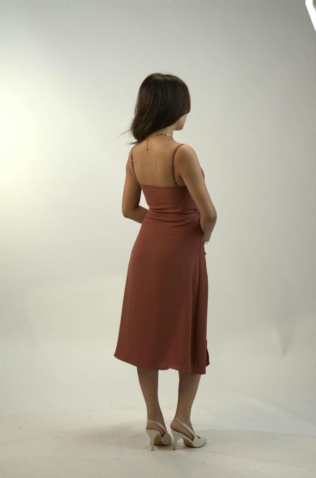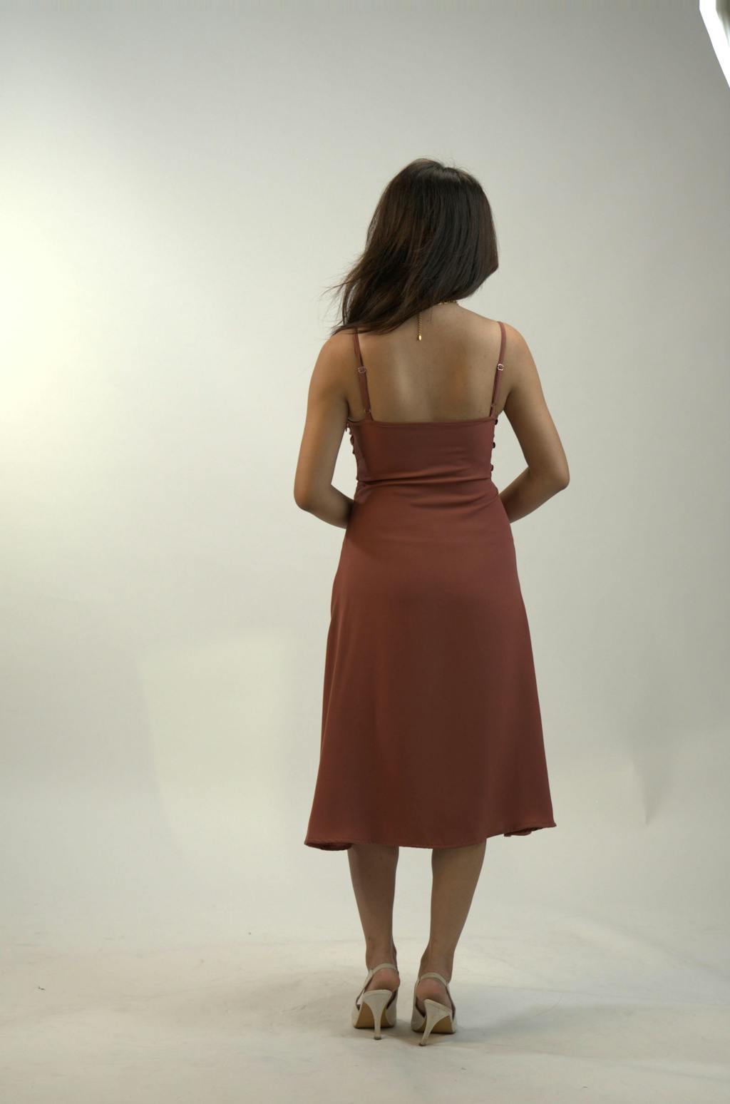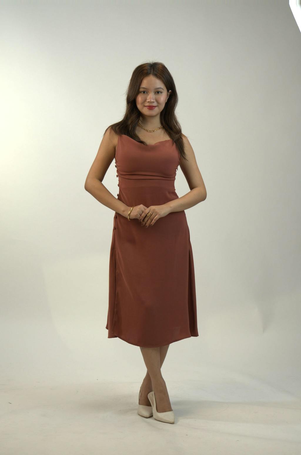 Minimal effort, maximum charm this cowl neck dress brings soft draping and sleek lines together in a perfectly peachy moment. With a ruched bodice, side slit, and dainty straps, it’s the kind of silhouette that works for both slow days and statement nights.