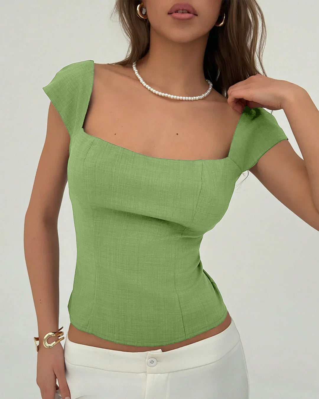 This light green top brings a fresh, clean look with a soft tailored feel. Designed with a structured square neckline, it frames the shoulders nicely and adds a polished touch without feeling stiff. The fitted bodice sits close to the body and highlights the waist, giving a neat and flattering shape. Cap-style sleeves balance the silhouette and keep it easy to wear for everyday plans. The soft green tone feels calm and modern, making this light green top a subtle standout in any casual wardrobe. Made from a polyester and cotton blend, it feels smooth, breathable, and comfortable through long hours.