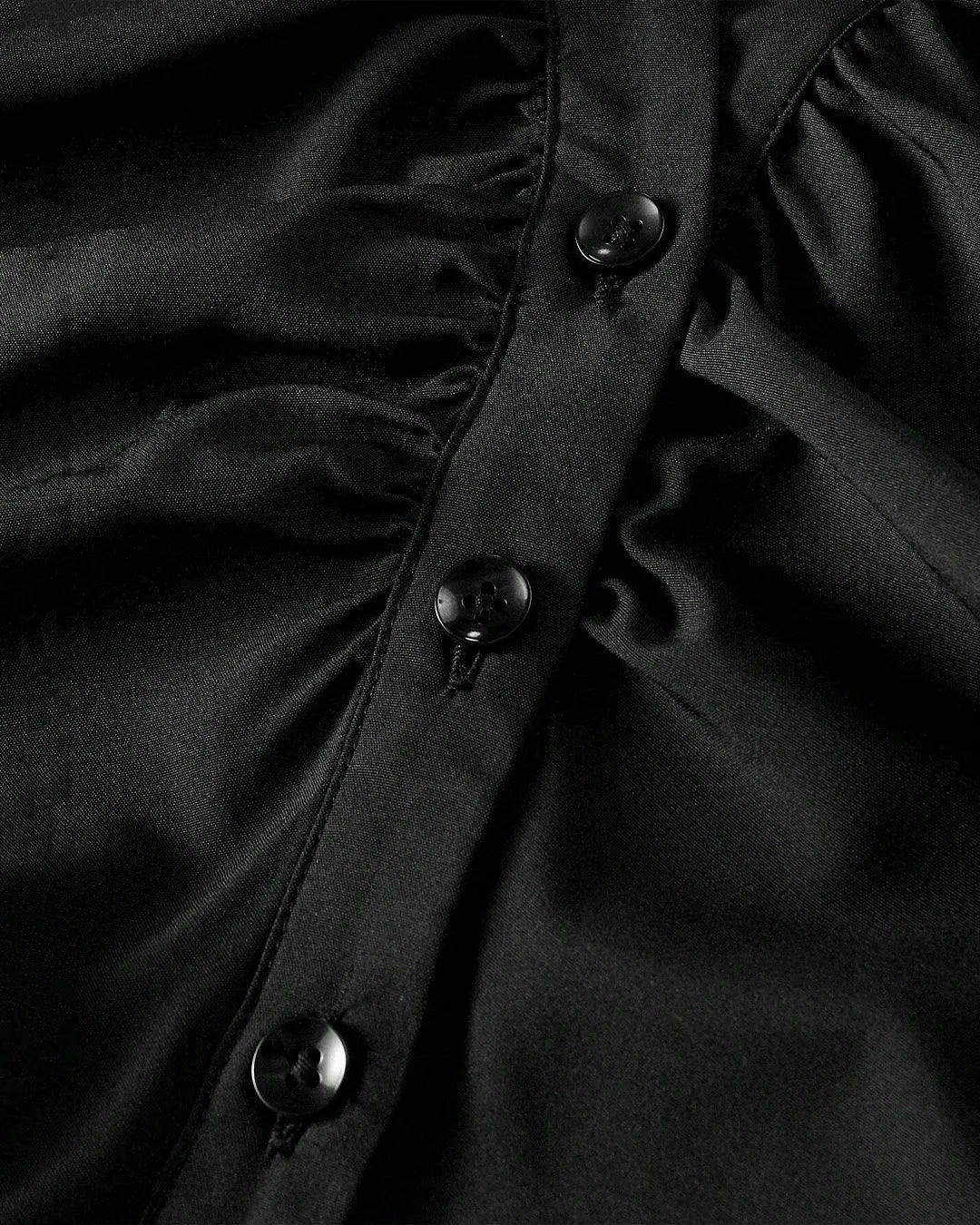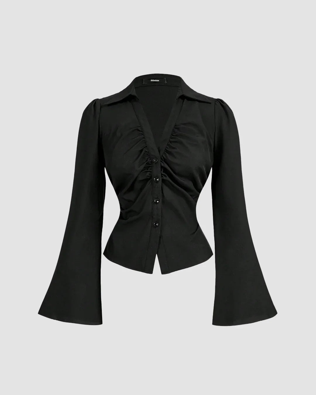 This flared sleeve shirt gives major drama with its statement cuffs and cinched silhouette. The ruched bust detail and V-cut front bring in soft curves, while the sharp collar keeps it bossy. It’s the kind of top that doesn’t whisper it speaks volumes.