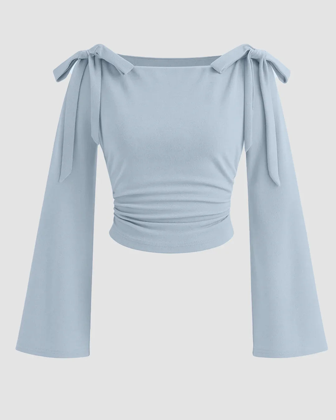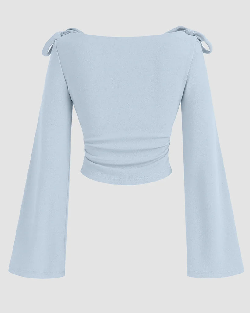 Boat Neck Bow Tie And Long Ruffled Sleeve Top in Ice Blue