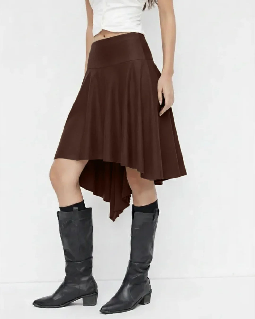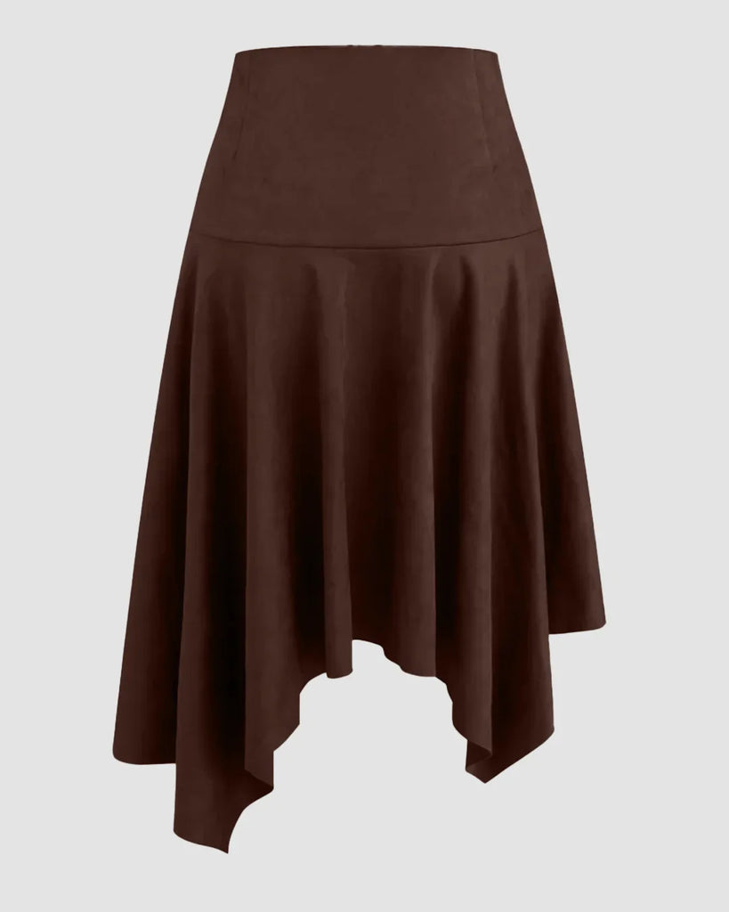 High-Waist Handkerchief-Hem Flared Midi Skirt in Dark Brown
