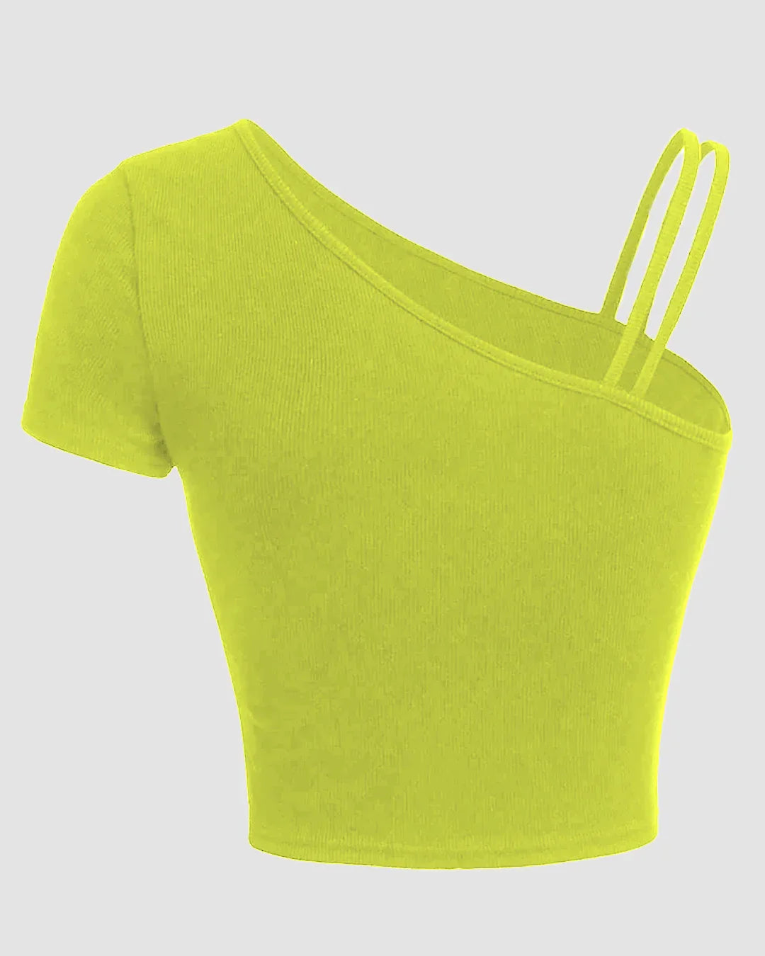 The One Shoulder Strap Detail Asymmetrical Top in Neon is made for statement-making style. Featuring a bold asymmetrical neckline with dual strap detail, this fitted crop silhouette gives your outfit an instant edge. The stretchy cotton-poly blend makes it super comfy yet fashion-forward, perfect for styling with high-waist jeans, skirts, or layered looks. Even though it’s a top, its standout vibe gives the same bold appeal as a lime green dress  playful, daring, and trend-driven.