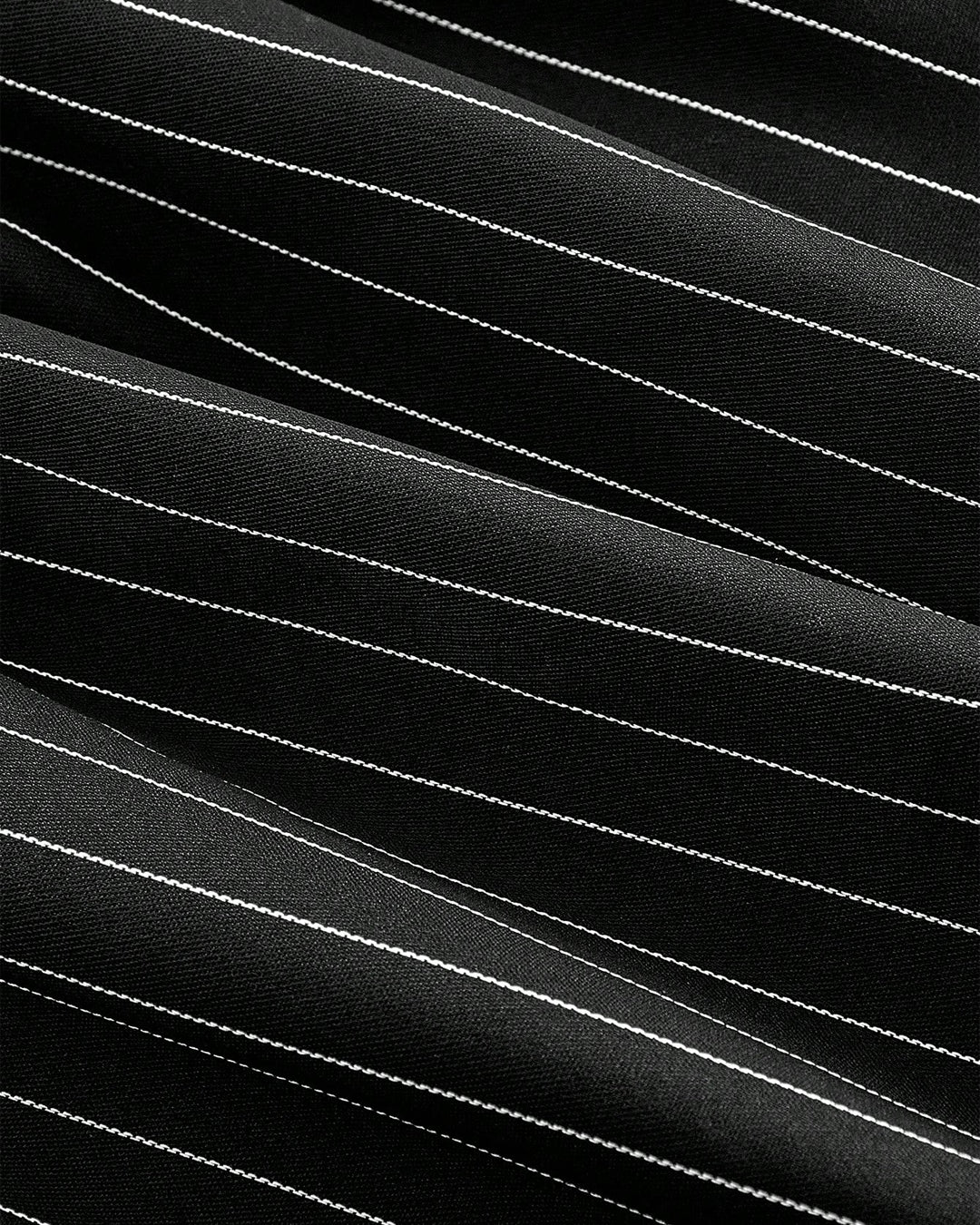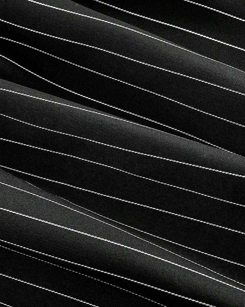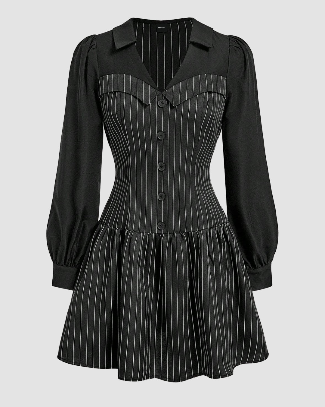 Pinstripe Collared Mini Dress With Ruffle Hem in Black comes with a sharp collar, soft pinstripes, and a fitted waist that shapes your look neatly. The slight flare at the bottom adds a fun touch, making this Pinstripe Collared Mini Dress easy to wear for both casual and dressed-up plans. The button-down front keeps it clean and minimal.