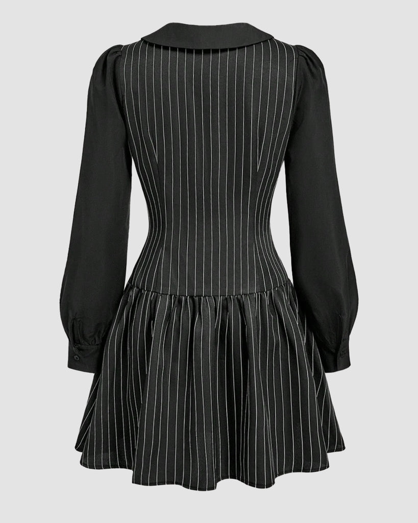 Pinstripe Collared Mini Dress With Ruffle Hem in Black