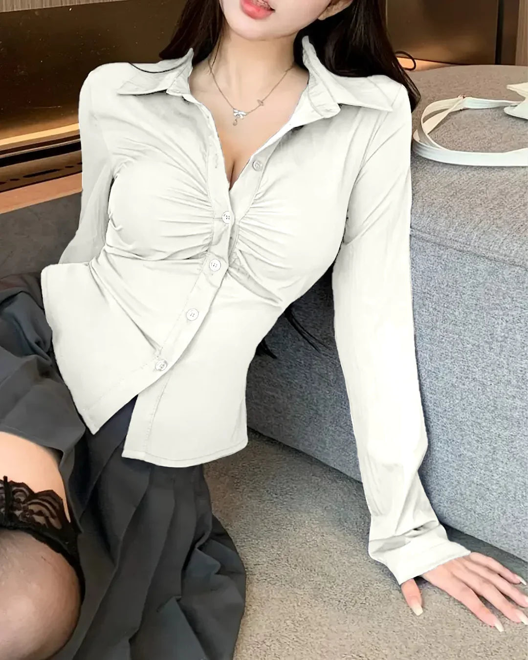 Ruched Front Button Collar Long Sleeve Shirt in Milky White