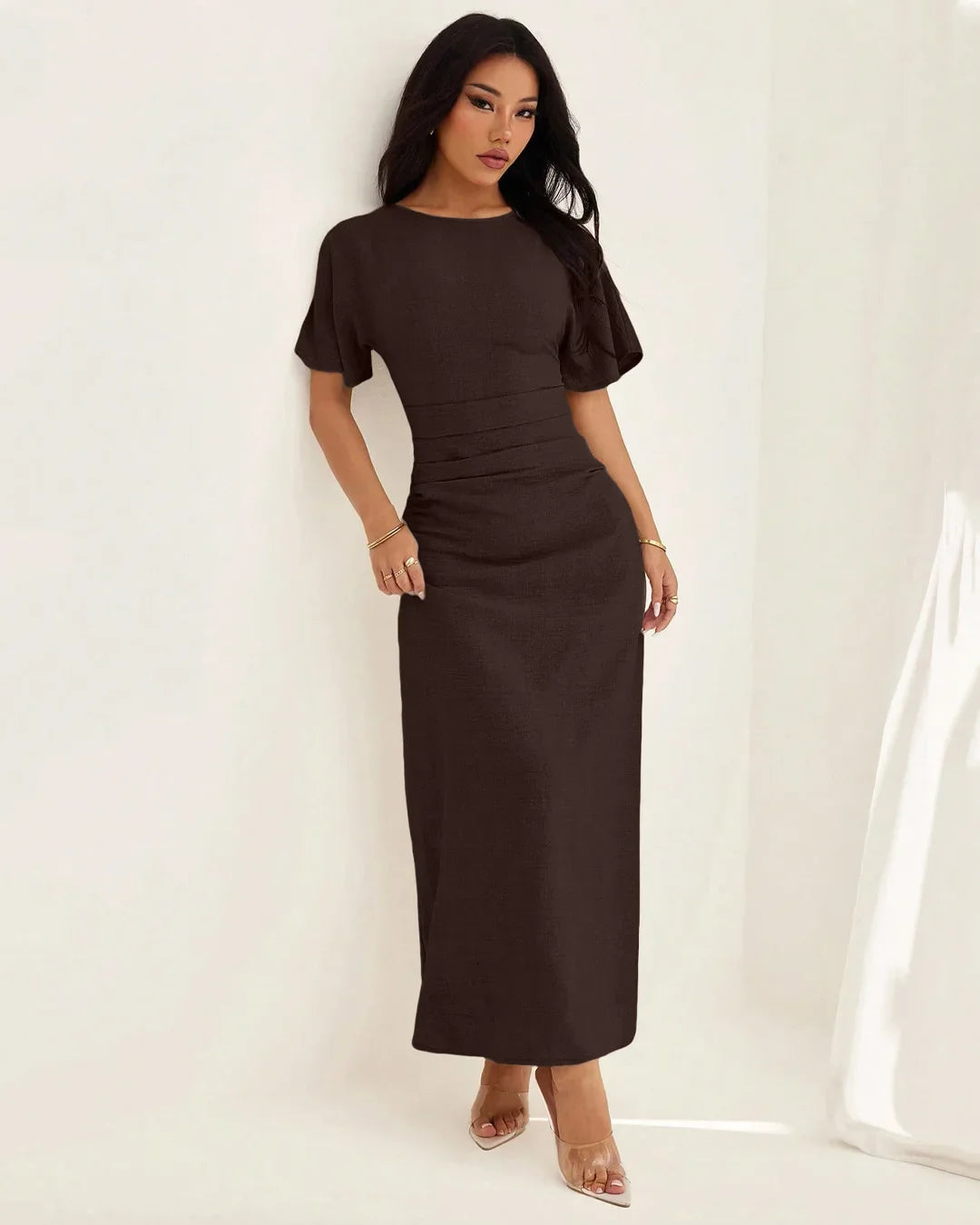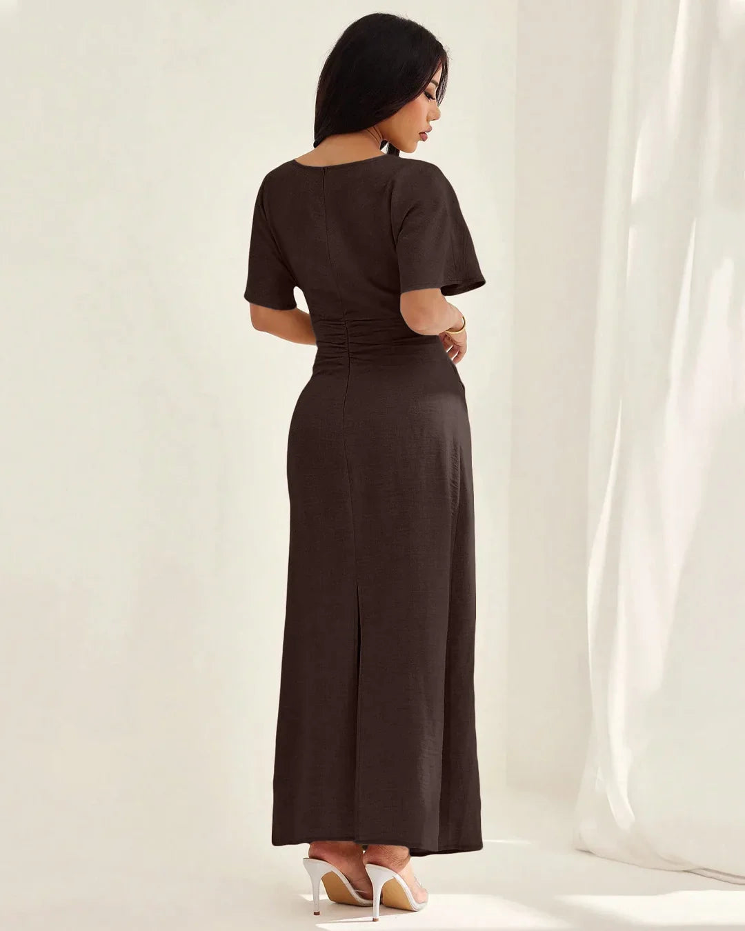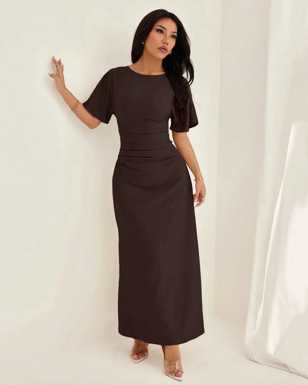 Brown Short Sleeve Ruched Waist Maxi Dress is one of those effortless pieces you’ll keep reaching for. Designed with a clean round neckline and short sleeves, this dress balances comfort with a flattering silhouette. The ruched waist detail softly cinches the midsection, creating a flowy fall that moves beautifully with every step.
