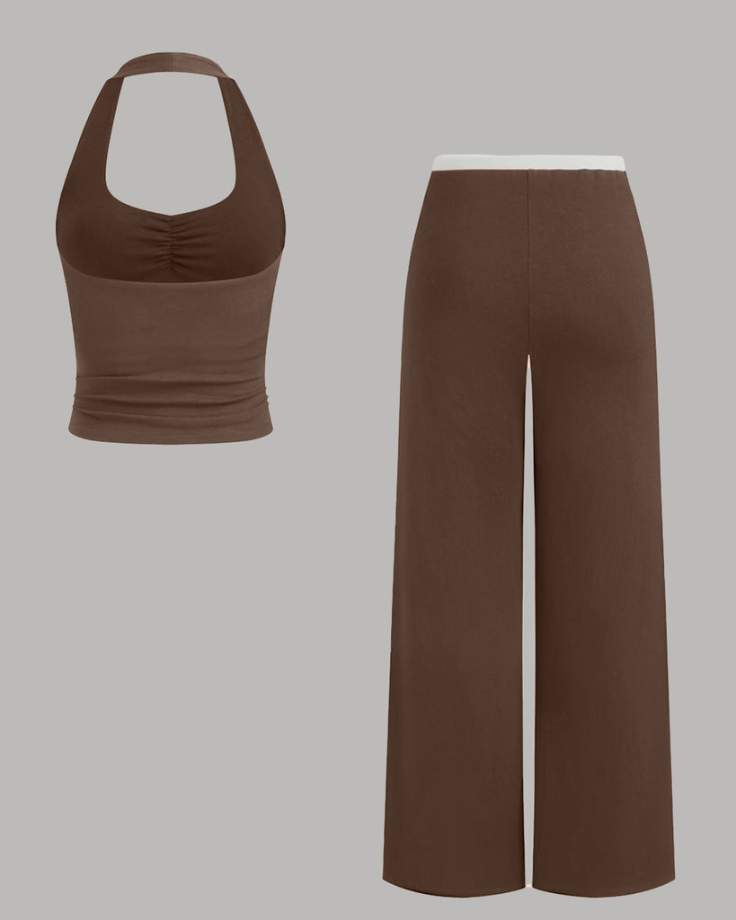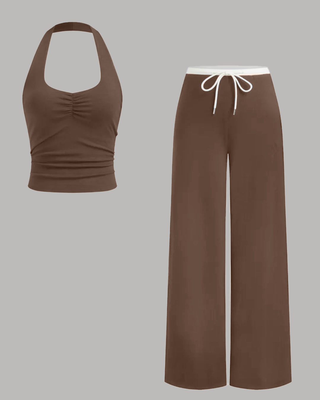 Halter Neck Ruched Top & Mid Rise Drawstring Straight Leg Trousers Set
