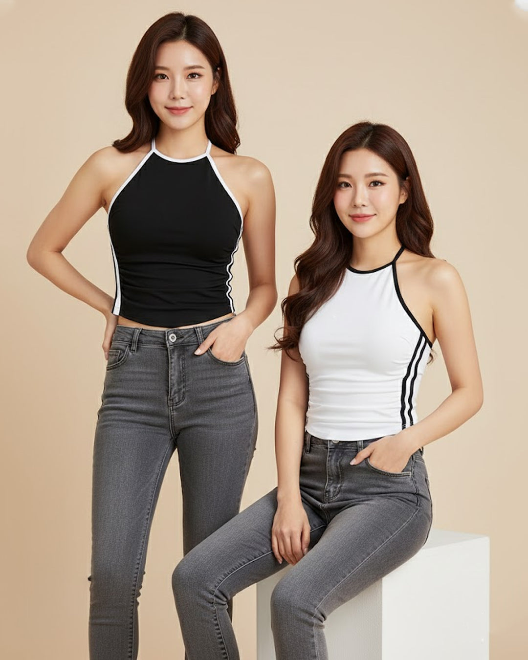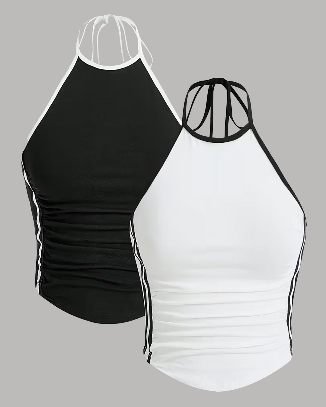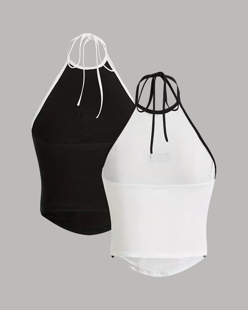 Combo of 2 : White and Black Halter Neck Lace-Up Sleeveless Top