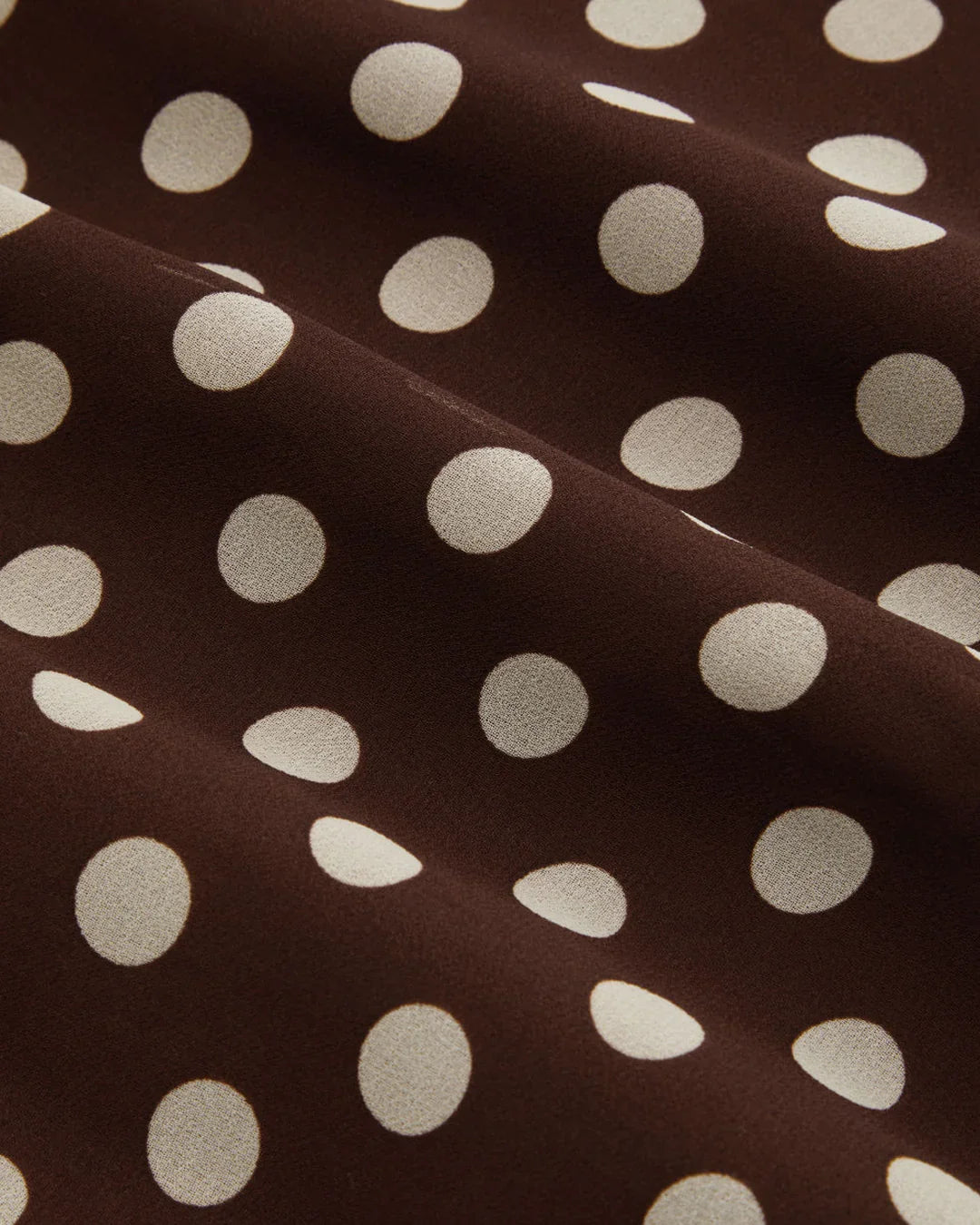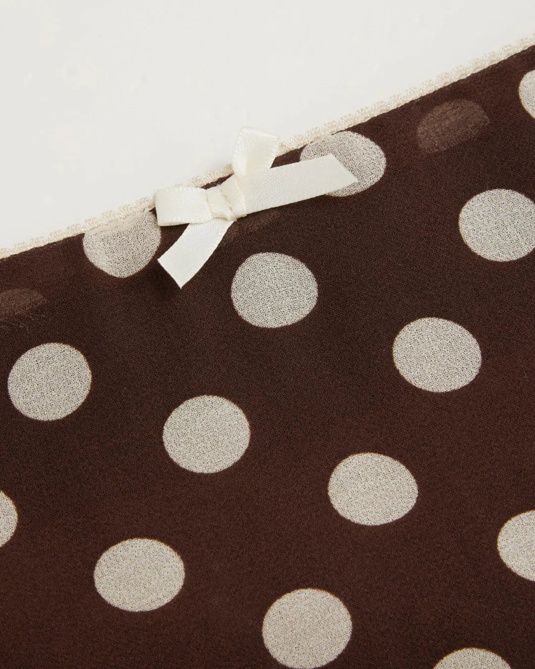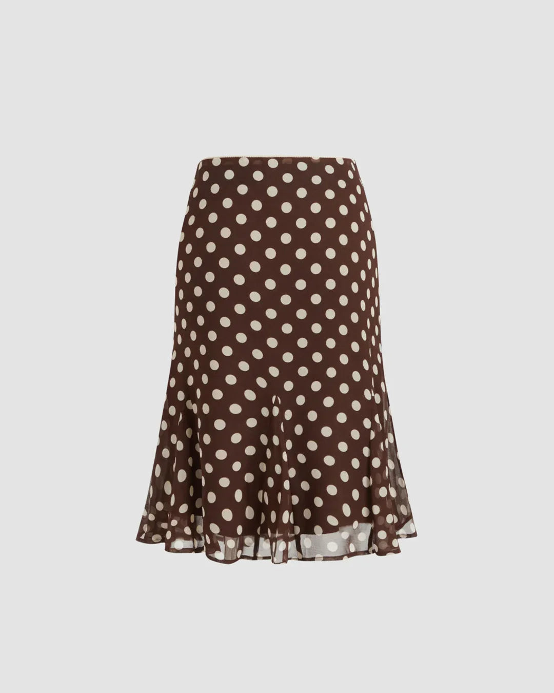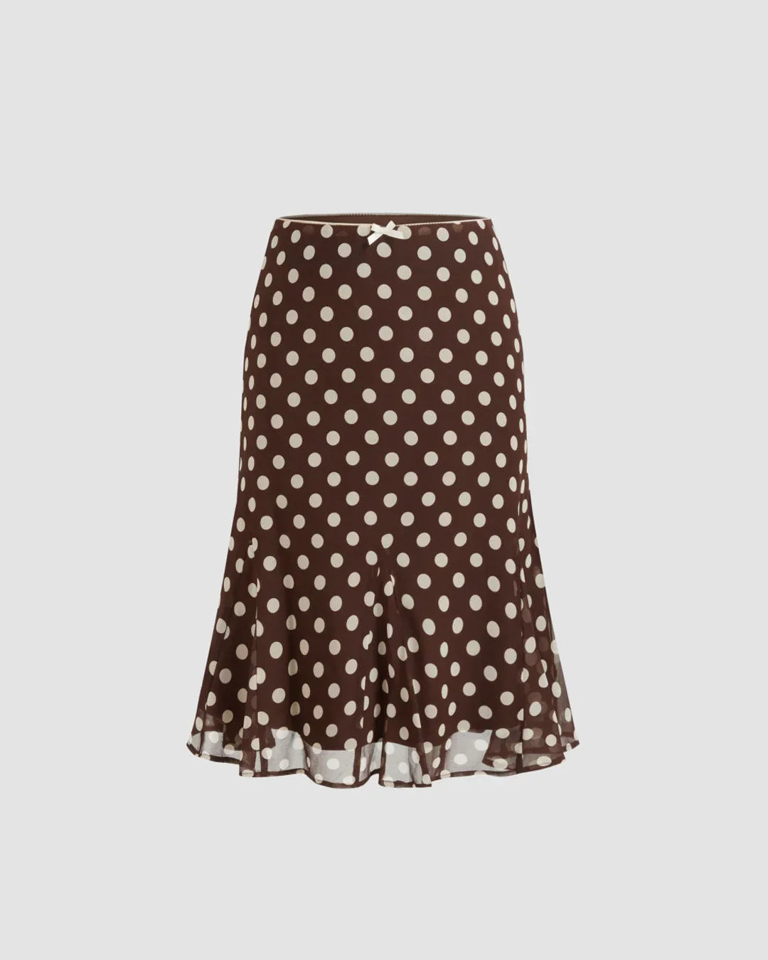 This polka dot skirt brings retro charm with a soft mermaid silhouette. Designed with a low-rise fit, it sits comfortably on the waist while creating a flattering shape through the hips. The classic polka dot print pops beautifully against the brown base, giving this polka dot skirt a playful yet refined vibe. The mesh overlay adds light movement, and the subtle bow detail enhances the feminine feel. This polka dot skirt flows gently into a mermaid hem, adding elegance with every step.
