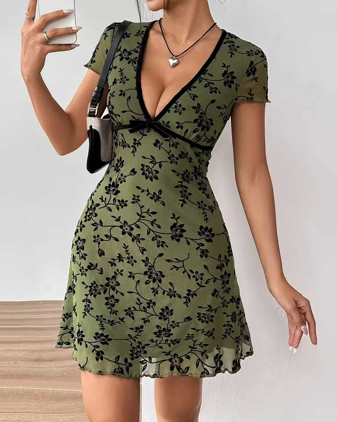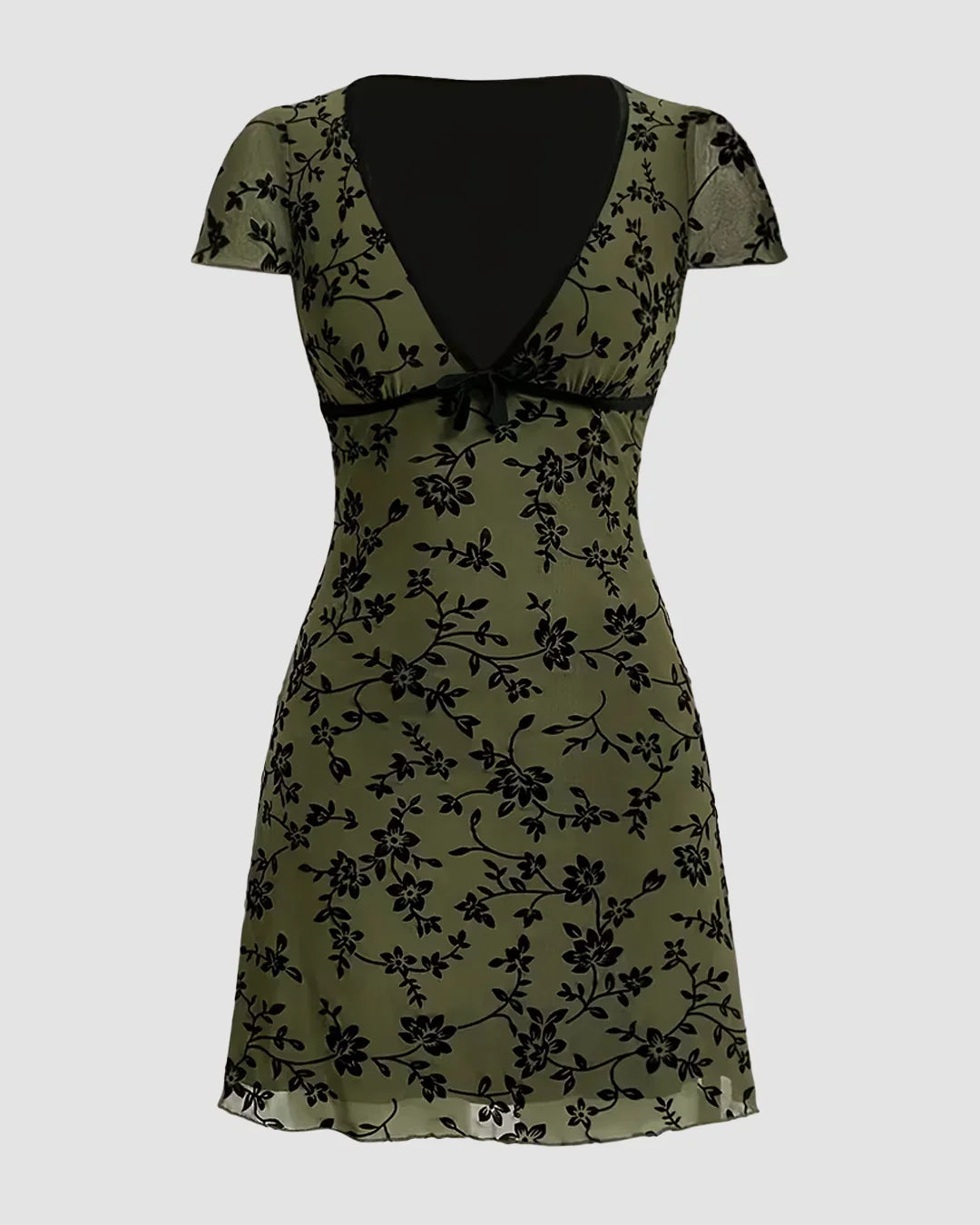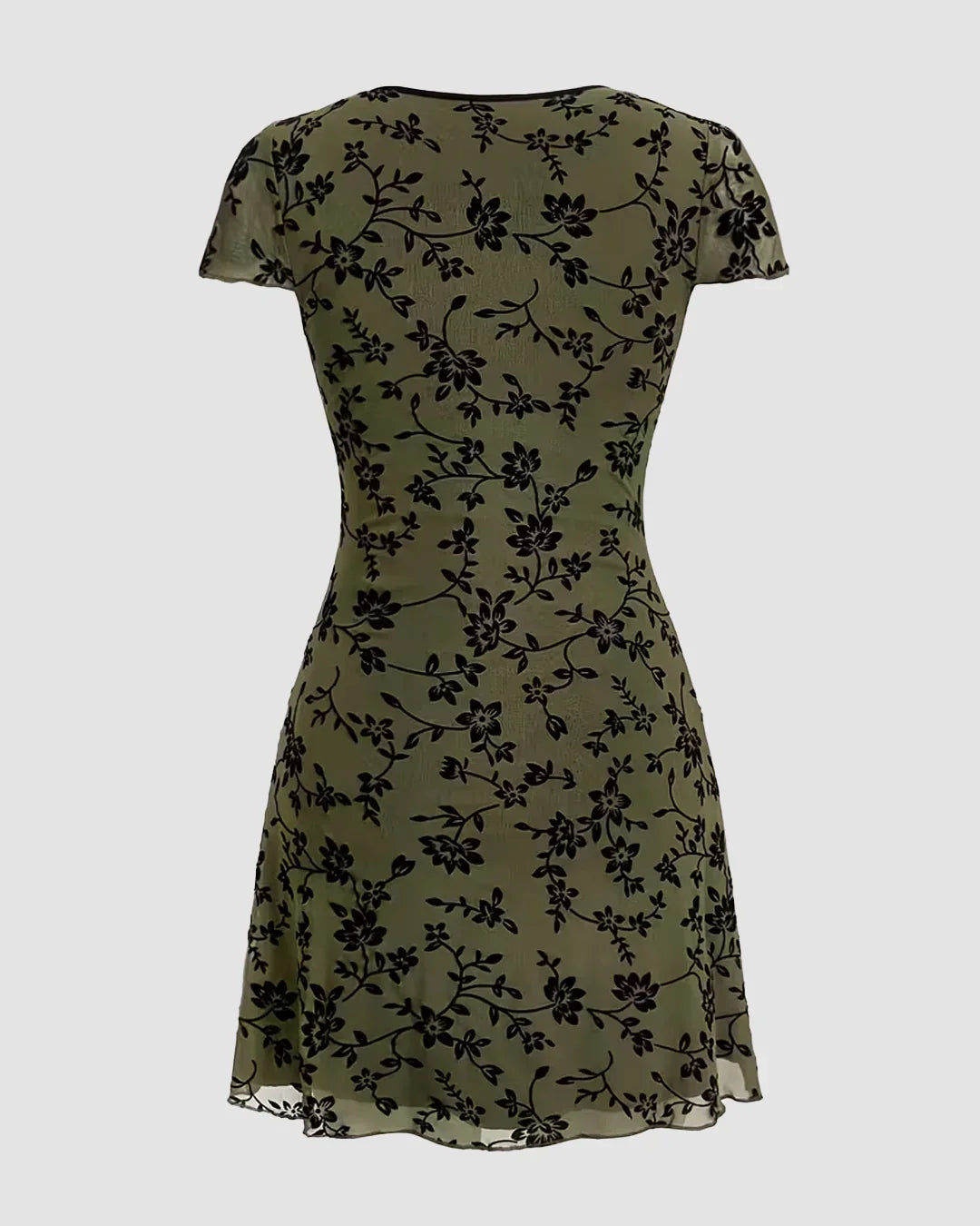 Floral Mesh V-Neck Short Sleeve A-Line Mini Dress in Green