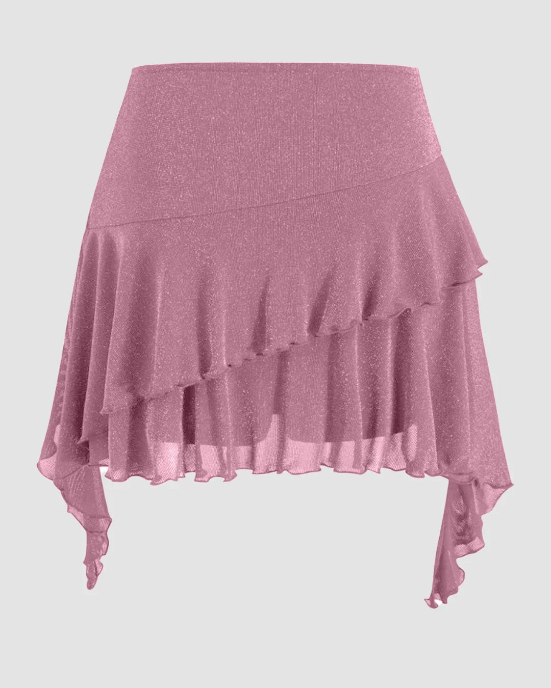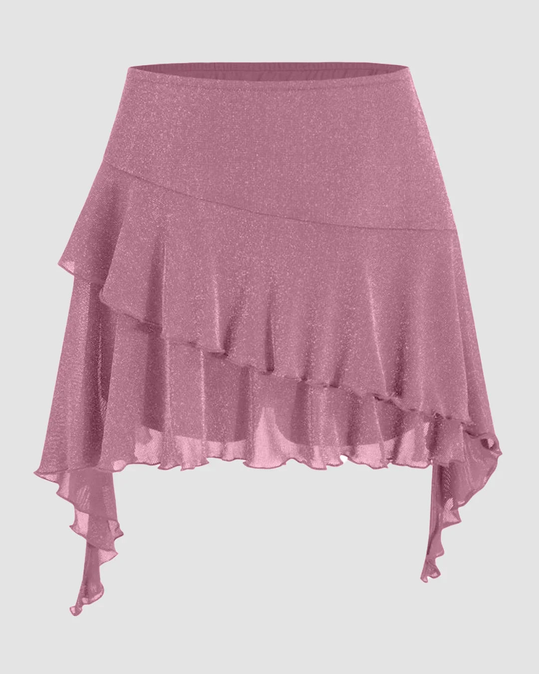Mid Rise Glitter Ruffled Hem Layered Mini Skirt in Pink brings playful shine with a flirty, movement-rich silhouette. Designed with soft layered ruffles and a subtle glitter finish, this skirt adds instant drama while still feeling easy to wear. The mid-rise fit sits comfortably on the waist, while the asymmetrical layered hem creates a light, flowy look that moves beautifully with every step. If you’re looking for something fun yet polished, this Layered Mini Skirt checks all the boxes.