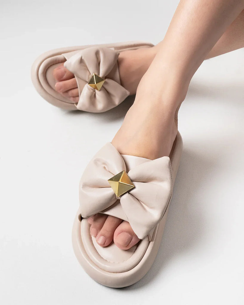 Quilted Slide Sandals With Bow And Gold Charm Detail